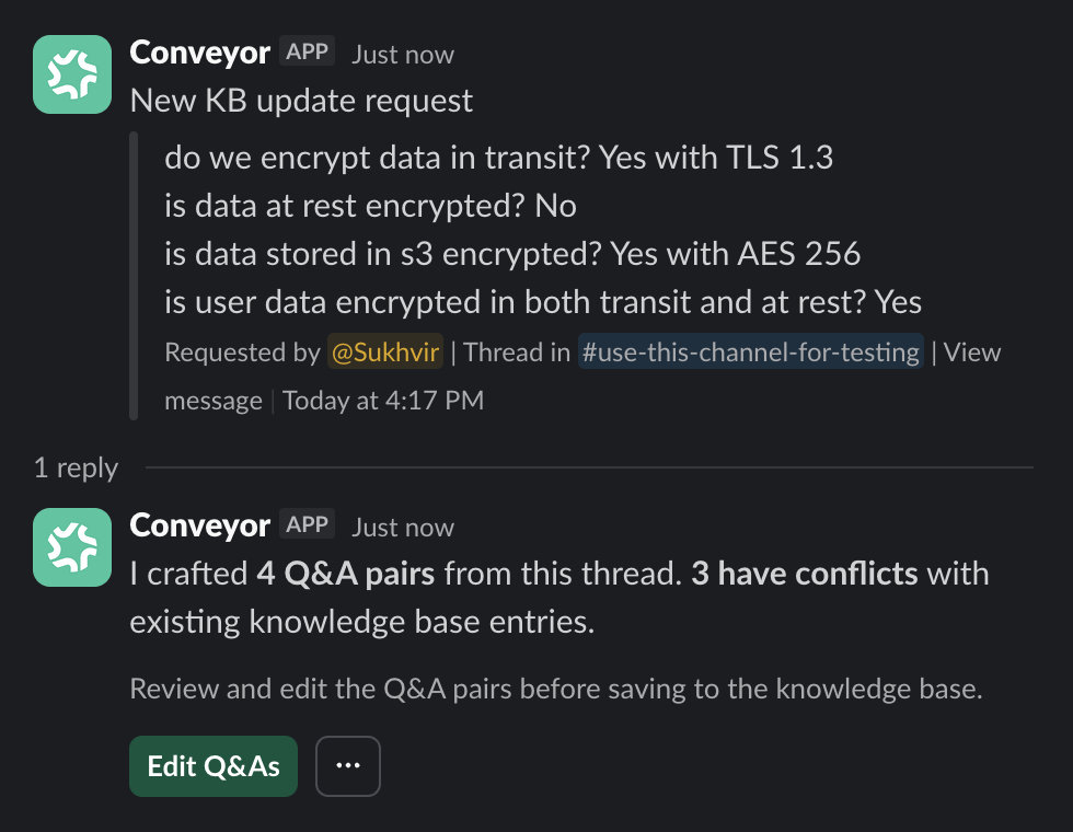 - ConveyorAI reads the full thread and extracts Q&A pairs from the conversation.