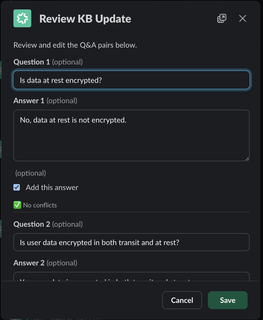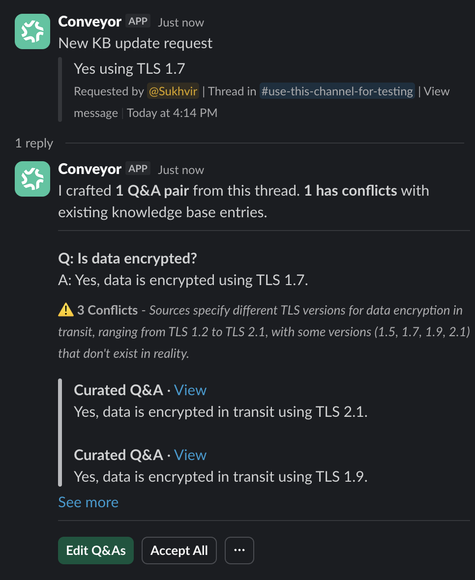 - A summary of the extracted Q&A pairs β along with any conflicts β is posted back to Slack.