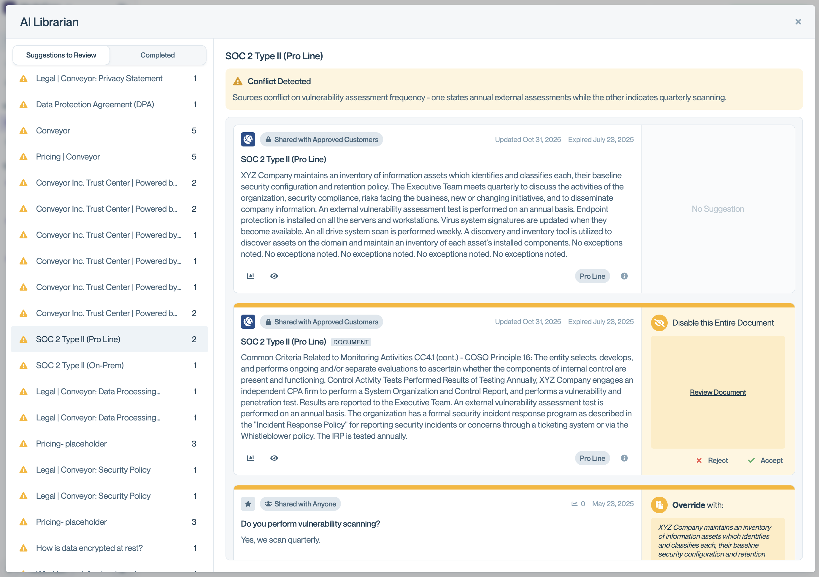 AI Librarian automatically detects conflicting information across your Knowledge Library and recommends resolutions. Instead of discovering inconsistencies when they surface in customer-facing answers, AI Librarian proactively identifies conflicts between your sources—like when a Curated Q&A contradicts your SOC 2 report—and suggests which source should take precedence.