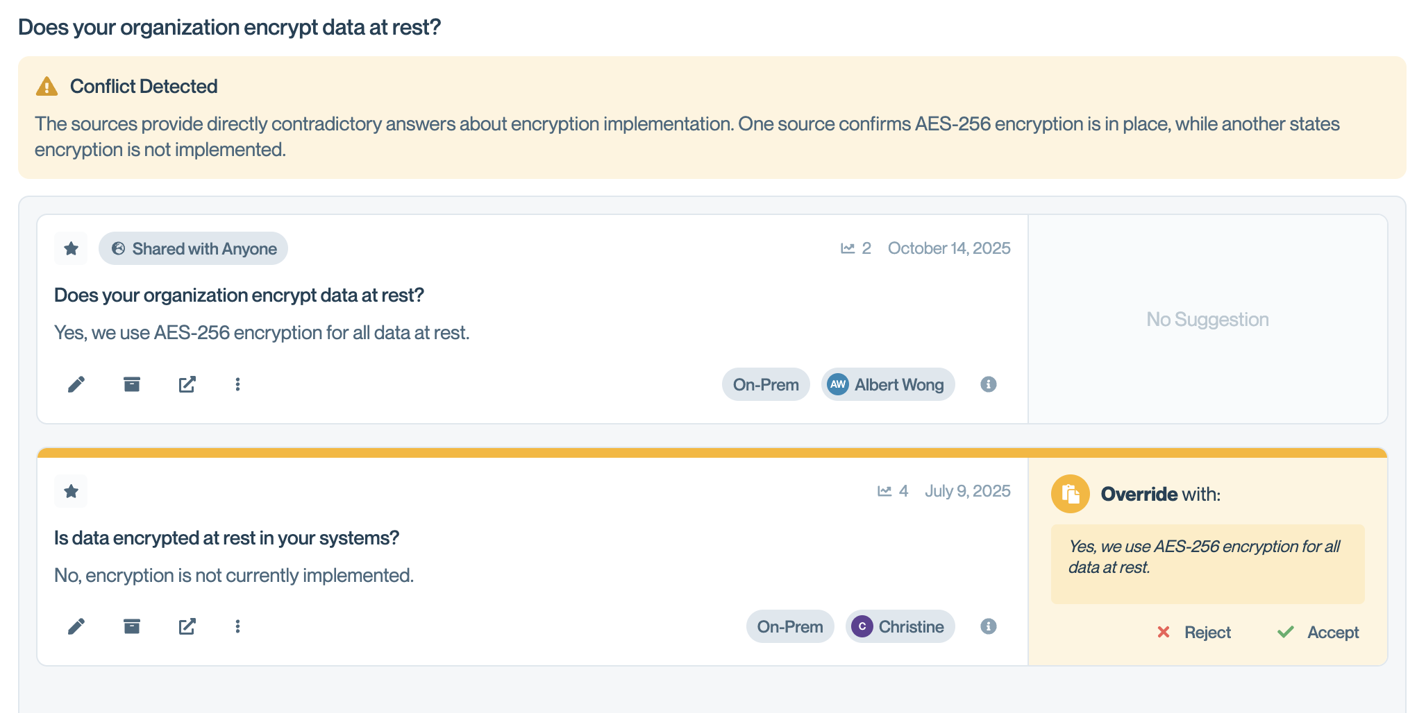 In the following example, the AI Librarian recommends overriding the older Curated QA with the correct answer. You can accept the overriding suggestion to update the conflicting Curated QA or reject it You can also see the reason for why the AI identified a conflict in the sources