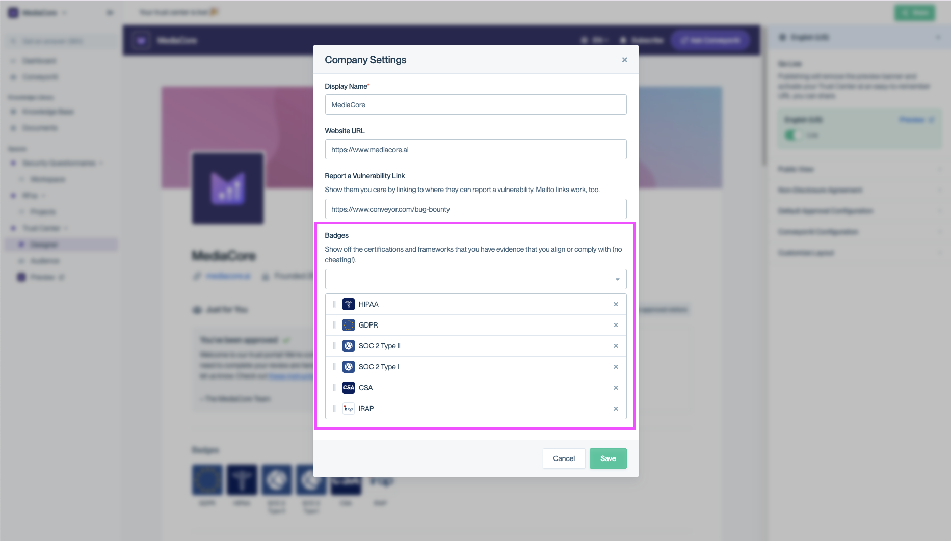 In the Company settings modal, you can fully control the badges displayed in your Trust Center.