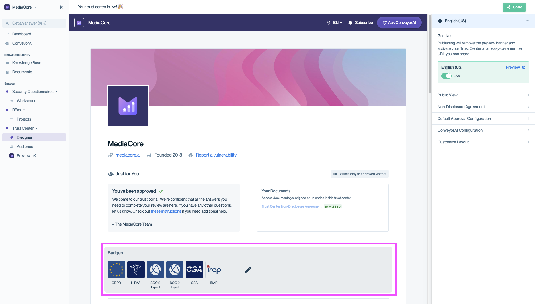 - Badges immediately appear in your Trust Center.