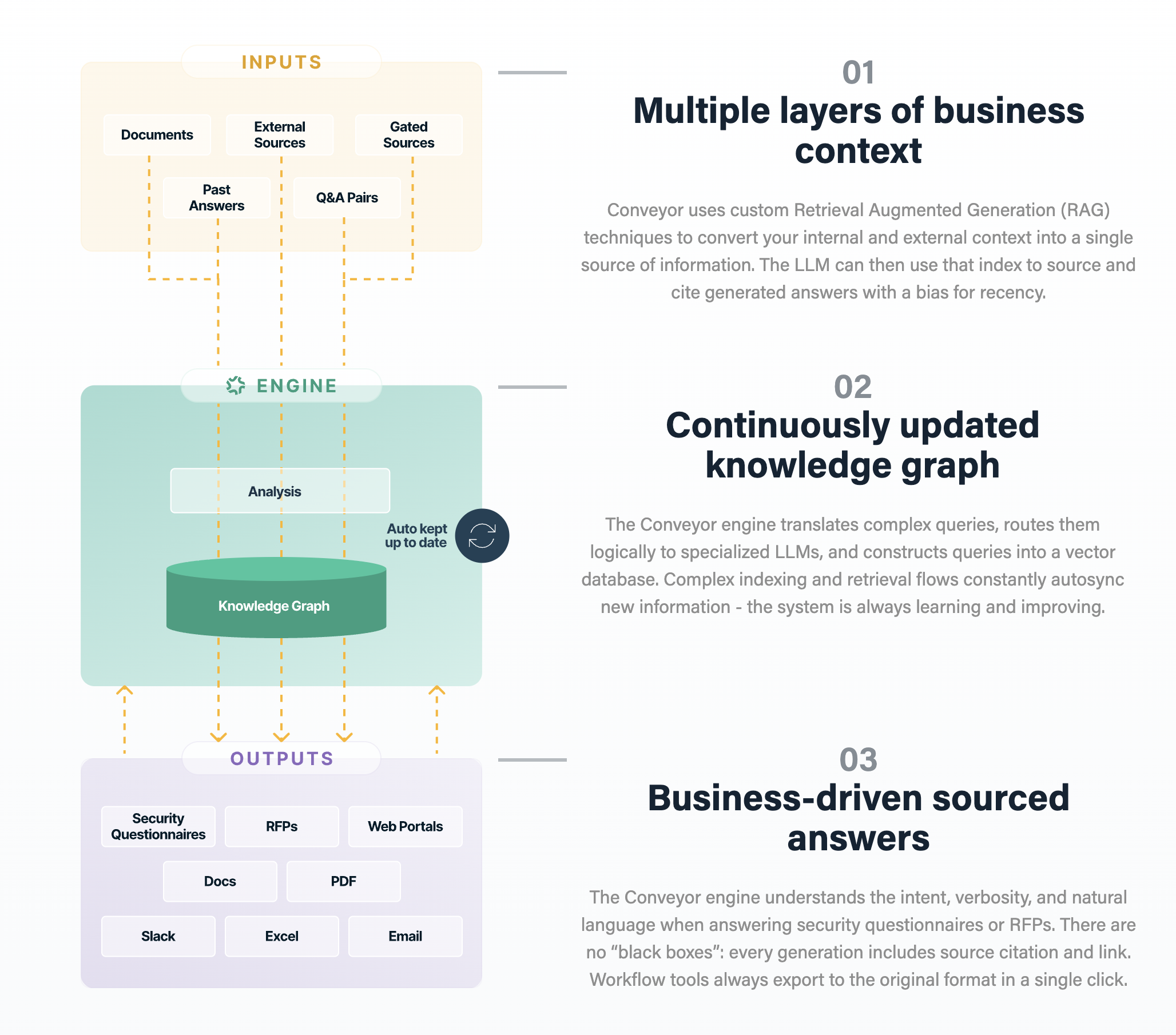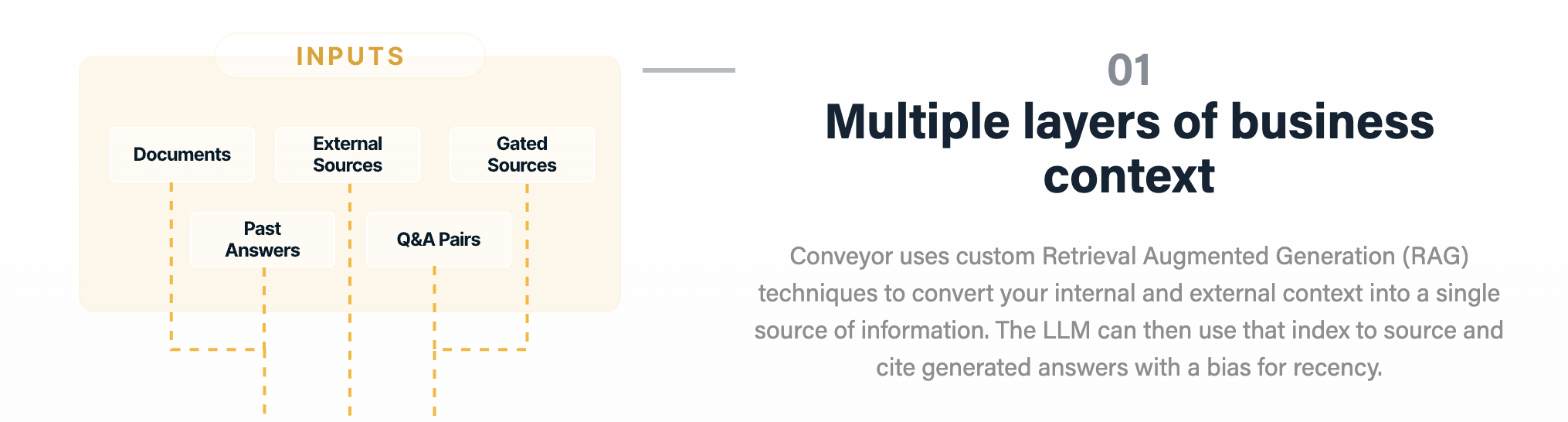 ConveyorAI bases its answers on your Documents, Past Answers, External sources, and Knowledge Base Question and Answer pairs ("Q&As"). By uploading sources, you can also share commonly requested artifacts like your SOC 2 directly with customers in a Trust Center..