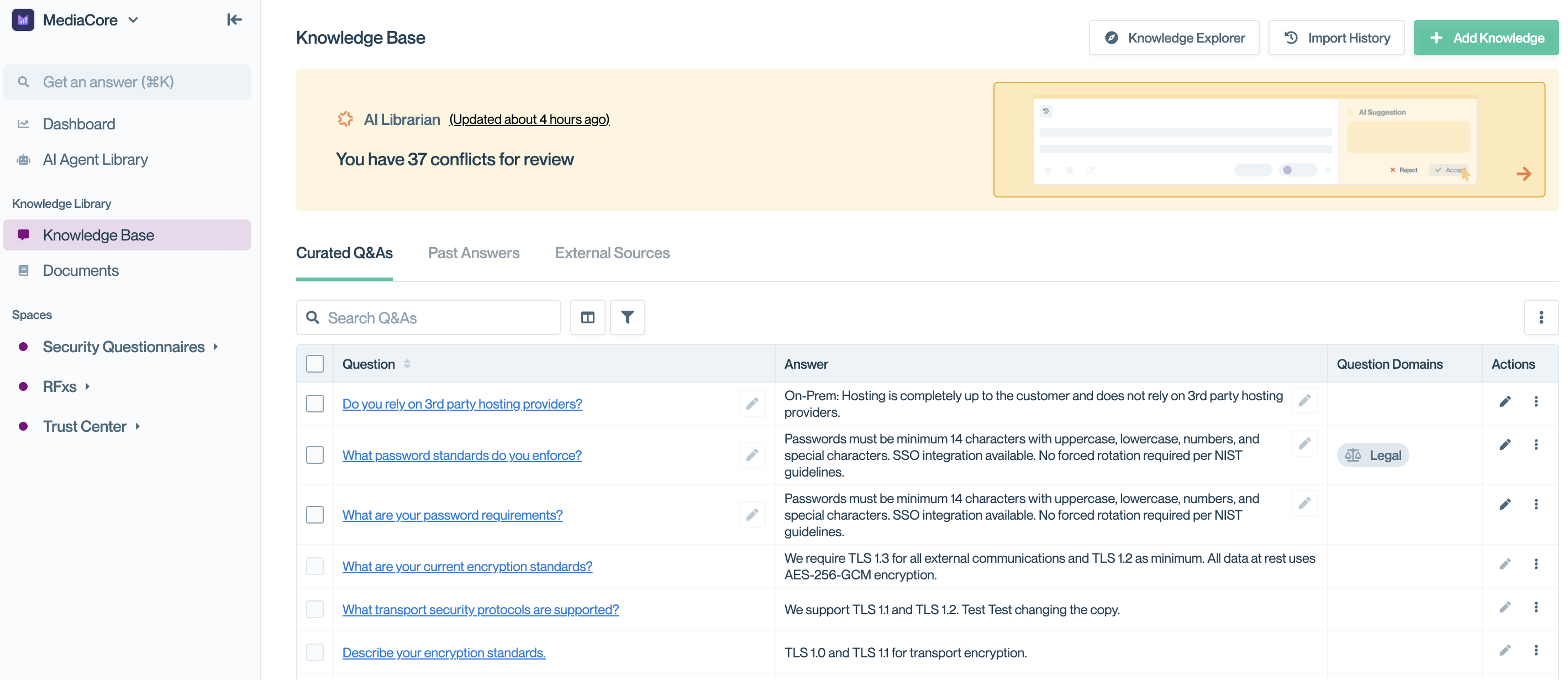 Curated Q&As: We recommend curating 200-400 Question and Answer pairs (Q&As) for best results. Curated Q&As can be also shared with customers via the Trust Center.