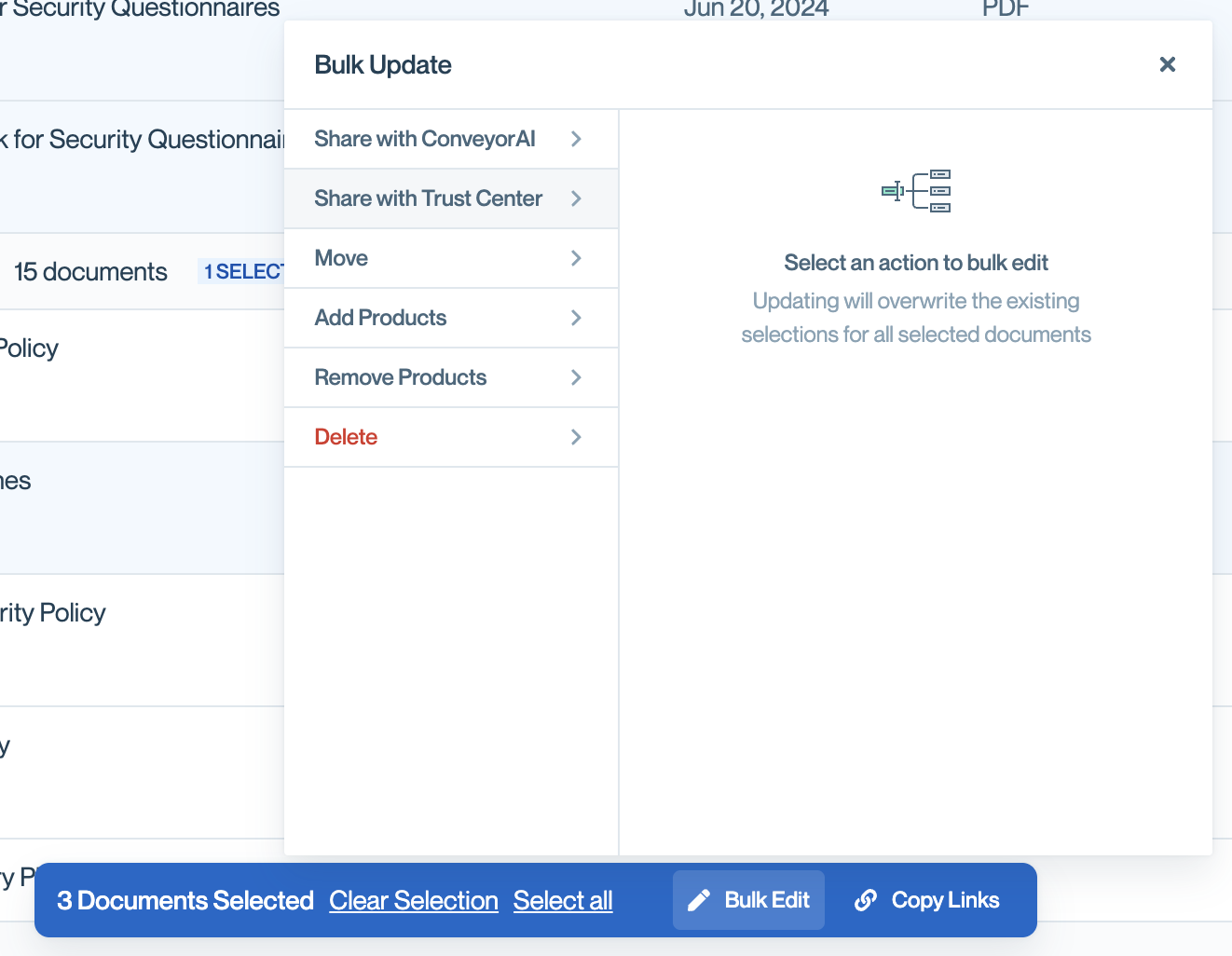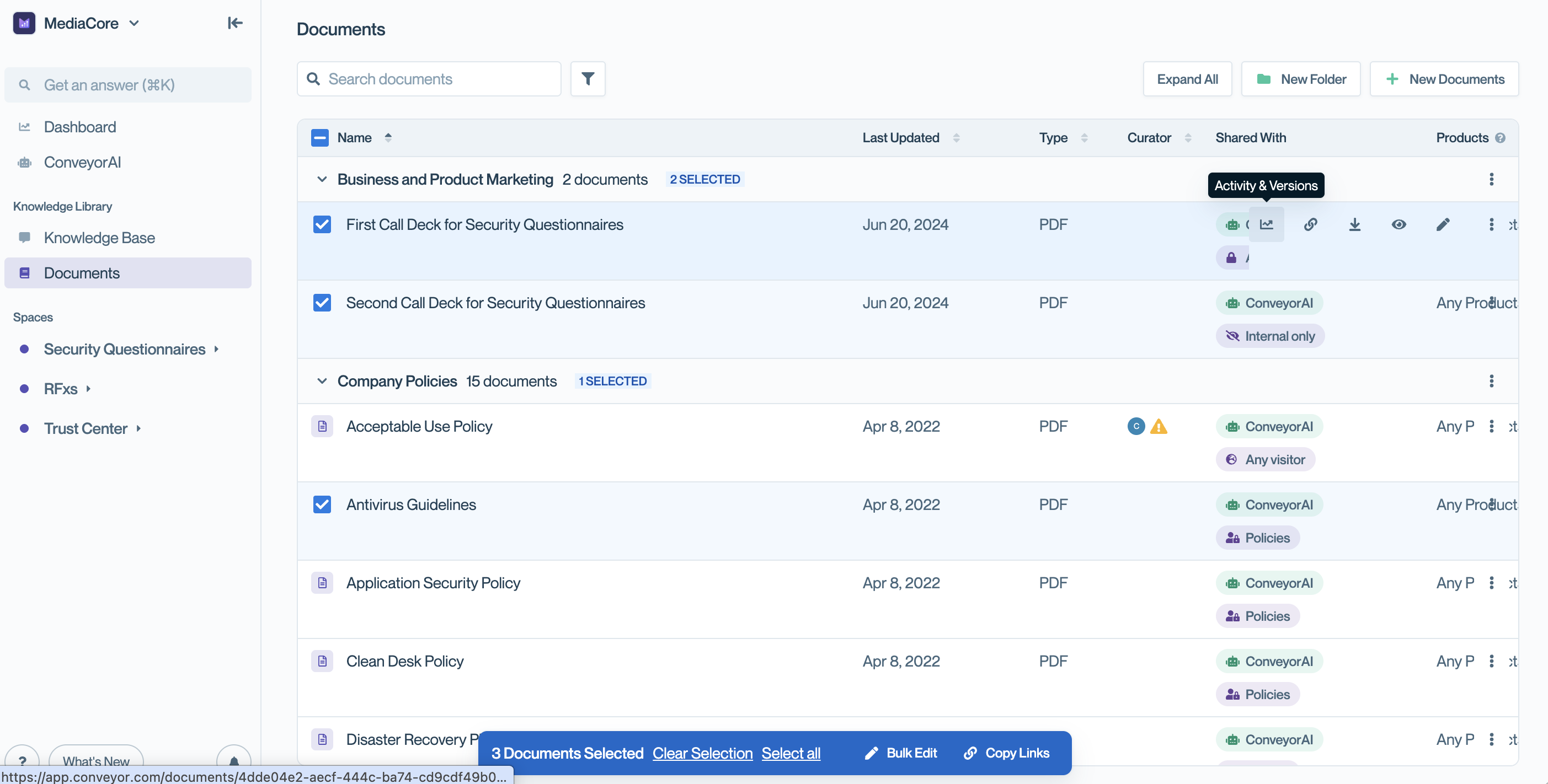 - Share with ConveyorAI – Enable or disable ConveyorAI access for all selected documents
