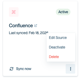 As of July 1, 2025, this is the new flow to connect to Confluence.If you have connected to Confluence in the old way, your existing sources will be affected - they will not continue to sync regularly. You will need to re-authenticate with Confluence to add new sources or edit existing sources or sync sources. This will only need to be done once.