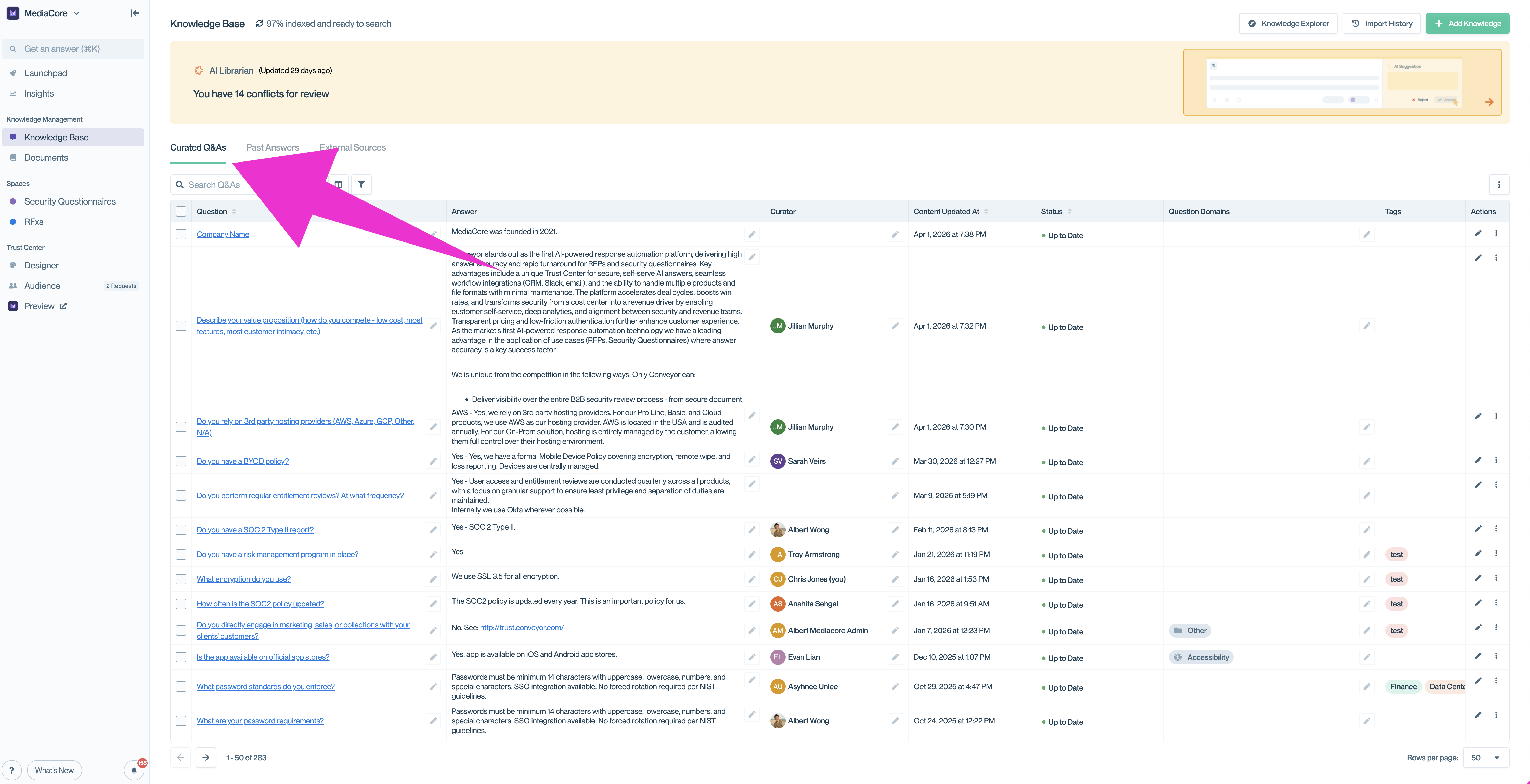Curated Question-Answer Pairs (Q&As) are your maintained library of frequently asked questions with authoritative answers. They serve as trusted sources that ConveyorAI prioritizes when generating responses to questionnaires and customer inquiries. Unlike Past Answers which accumulate automatically, Curated Q&As support active maintenance through curator assignments, verification periods, and controlled access levels. You can also share them directly with customers via your Trust Center for self-service.