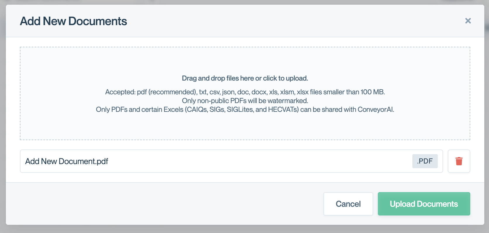 - Set if you want to share this document with: ConveyorAI (limited to PDFs, HECVAT, SIG, and CAIQ questionnaires) or Trust Center Audience.