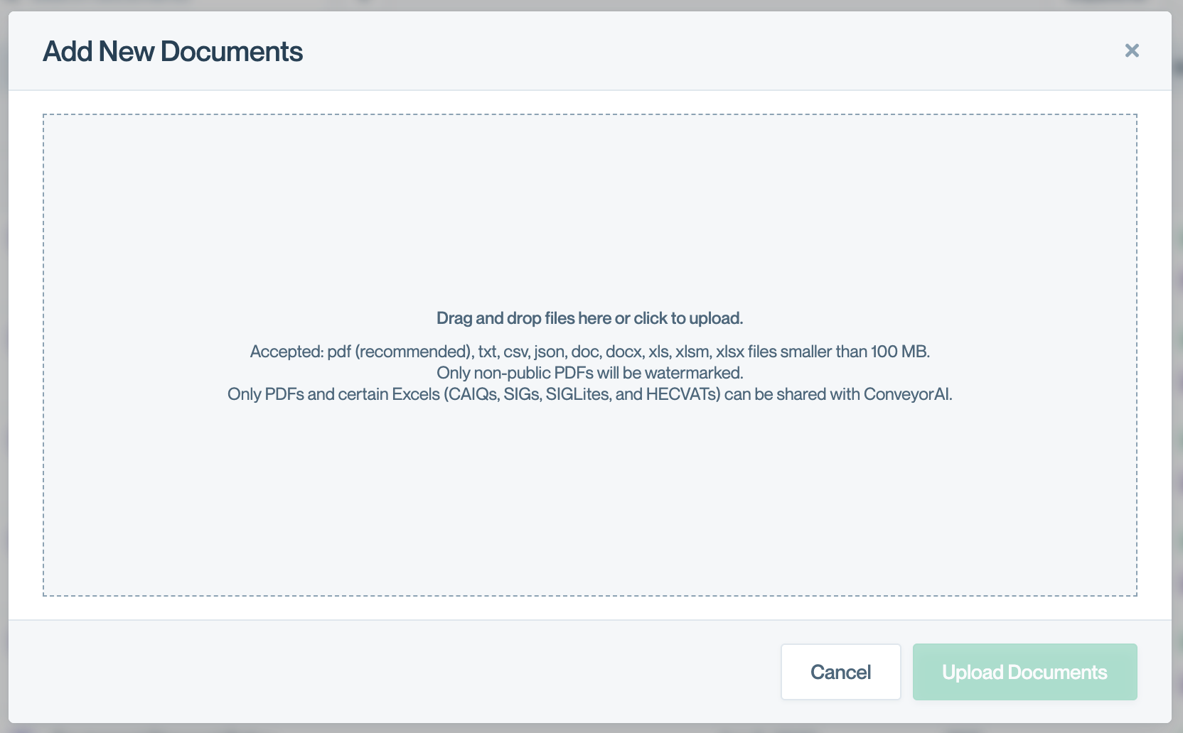 Upload security and compliance documents to power ConveyorAI's questionnaire responses and share materials with customers via your Trust Center. Documents can be added individually or in bulk, with options to control visibility, assign curators, and configure how they're used across Conveyor.