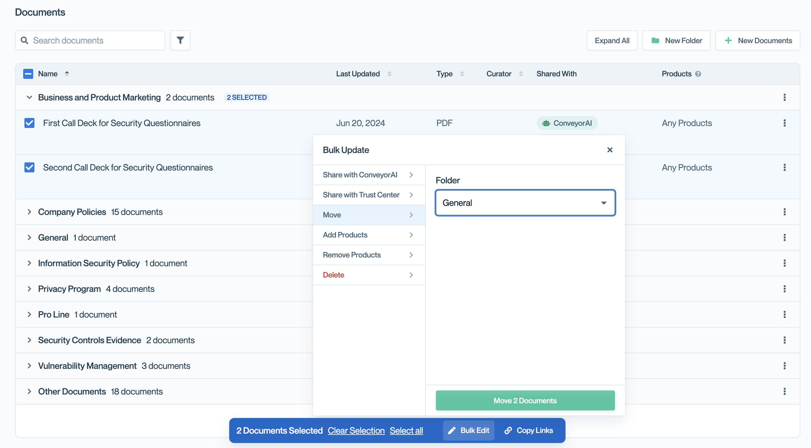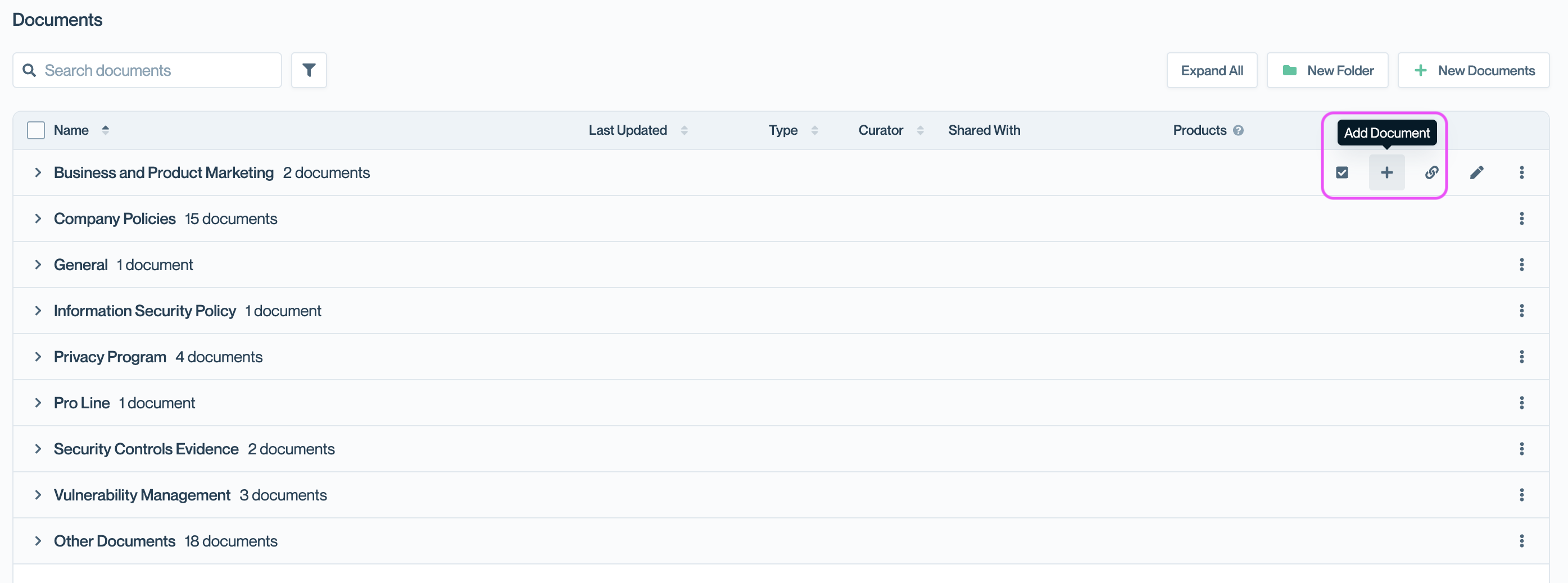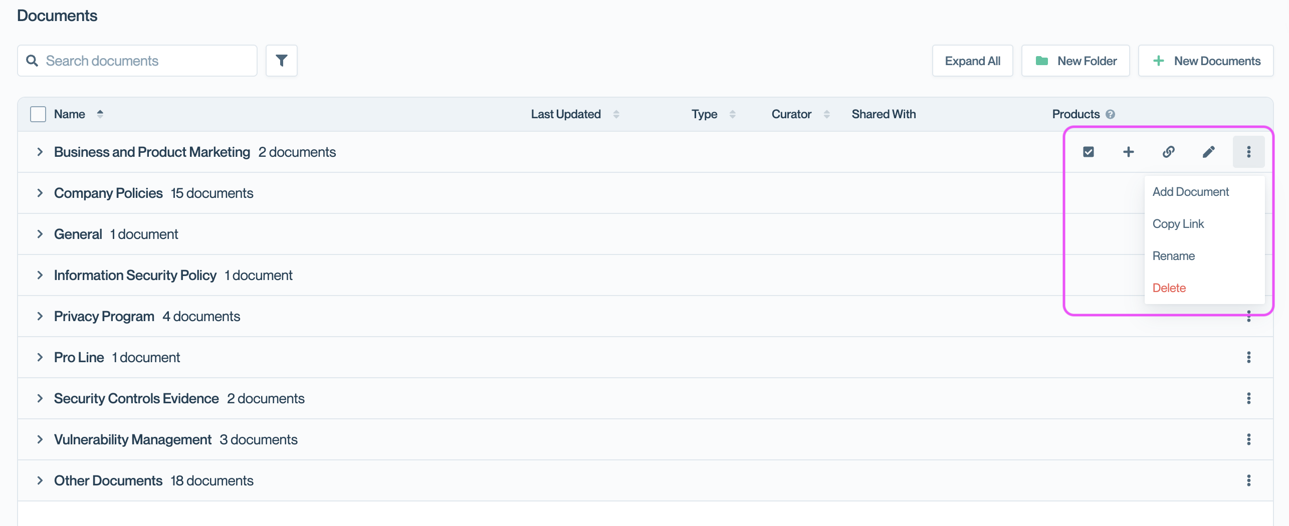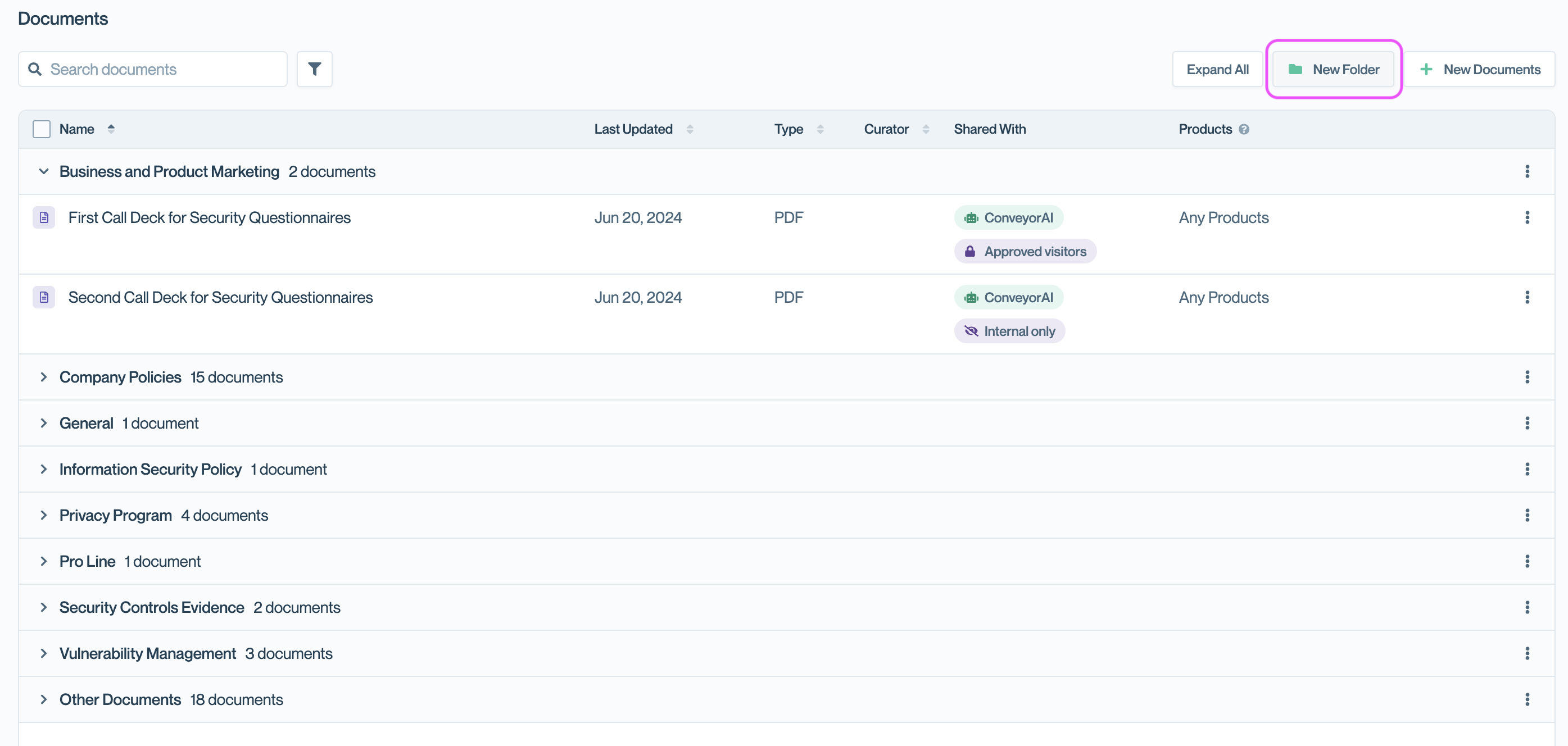 Folders help you organize documents for both your internal team and customers visiting your Trust Center. Group related documents together—such as compliance certifications, company policies, or product-specific materials—to make navigation easier and keep your Trust Center tidy.