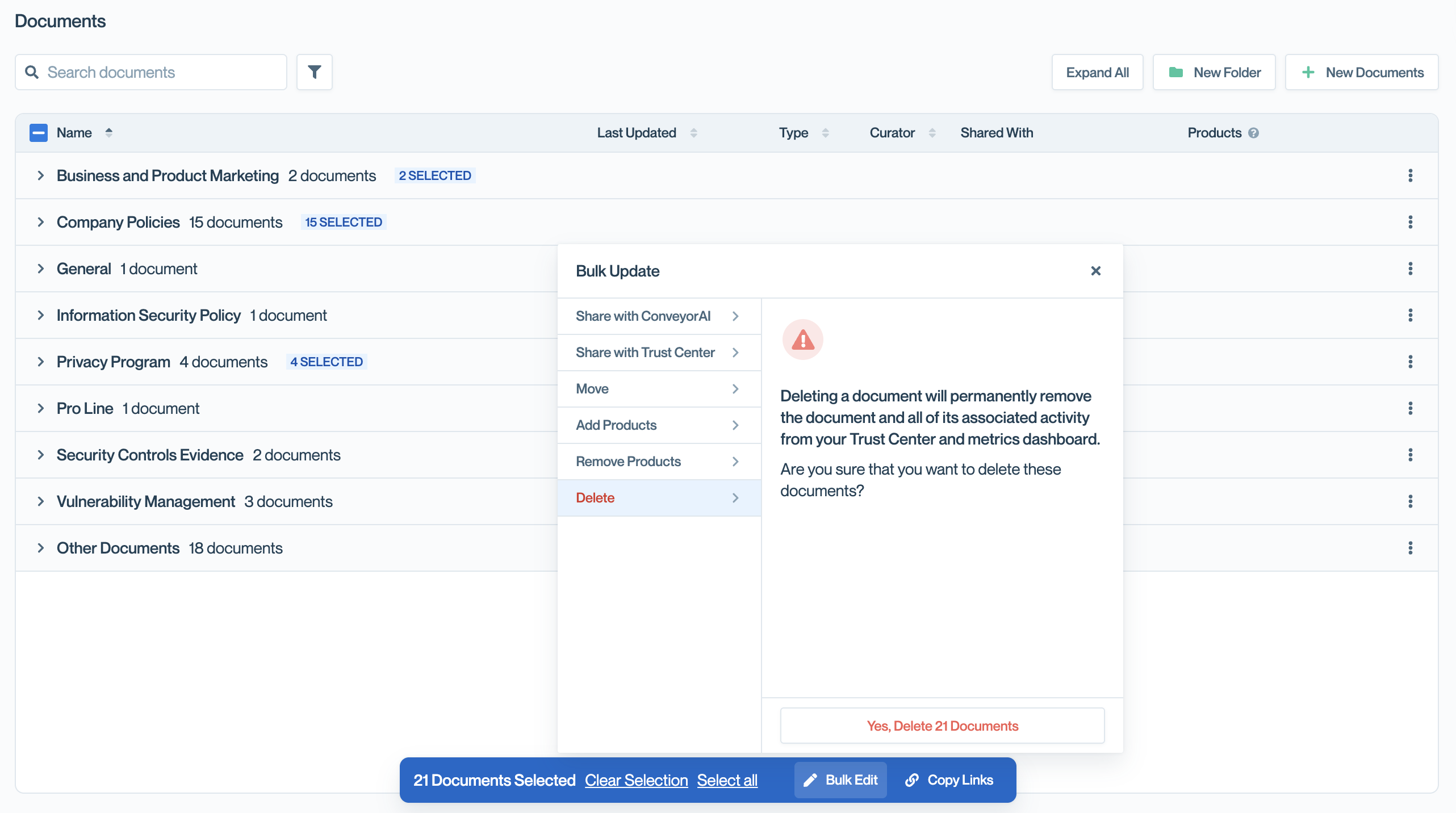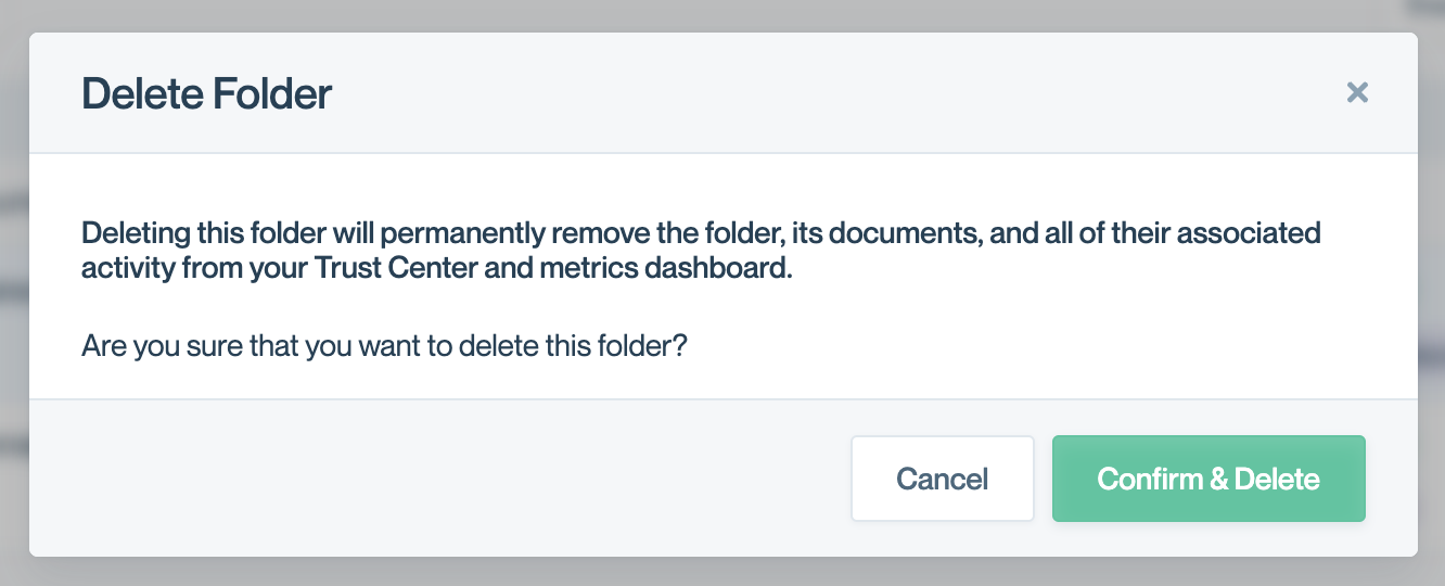 Deleting a folder permanently removes the folder, all documents inside it, and their associated activity from your Trust Center and metrics dashboard.