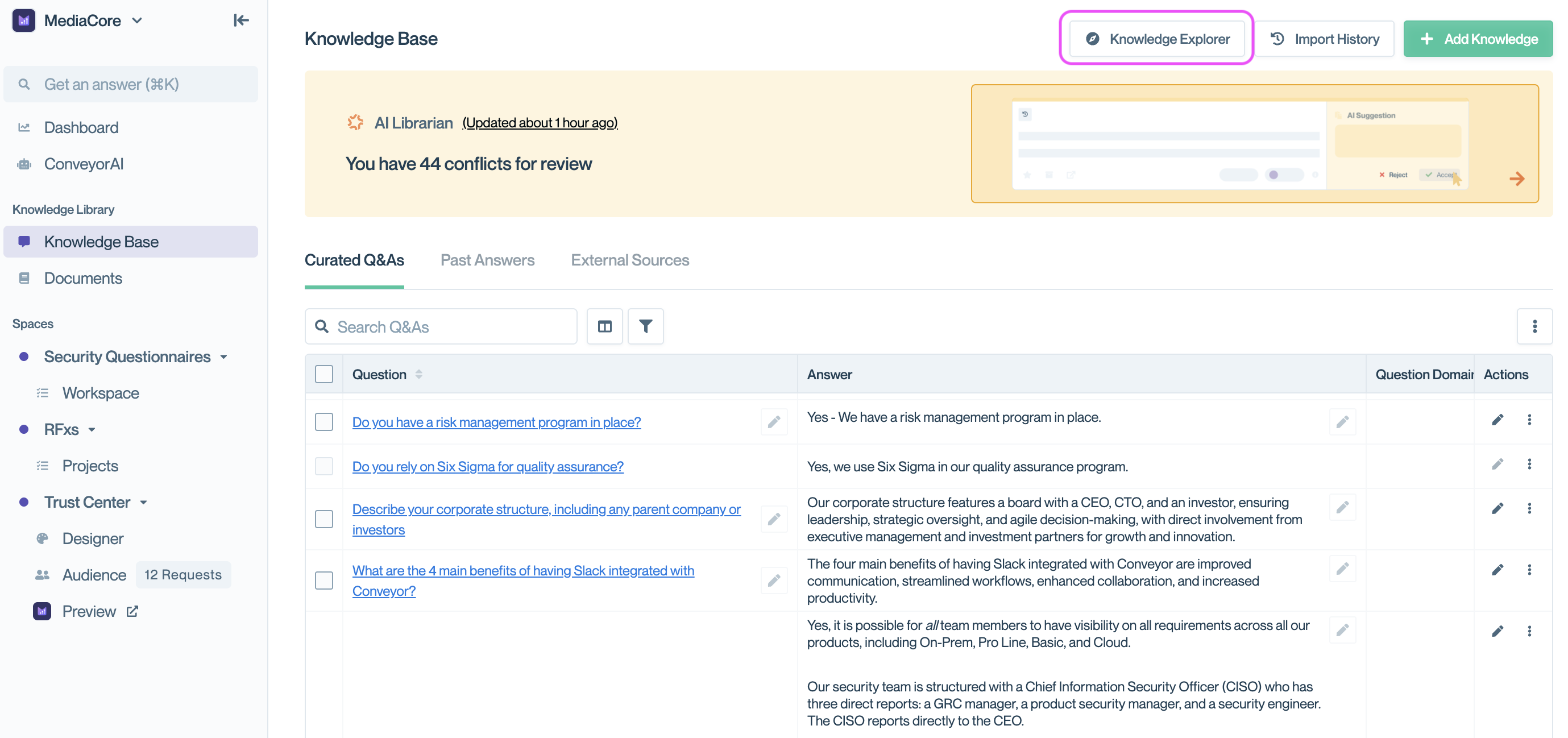 Explorer analyzes your Knowledge Library coverage against Conveyor's benchmark question set—a curated collection of questions drawn from thousands of questionnaires across industries. Instead of guessing where your knowledge falls short, Explorer shows you exactly which topic areas need attention so you can prioritize content additions strategically.