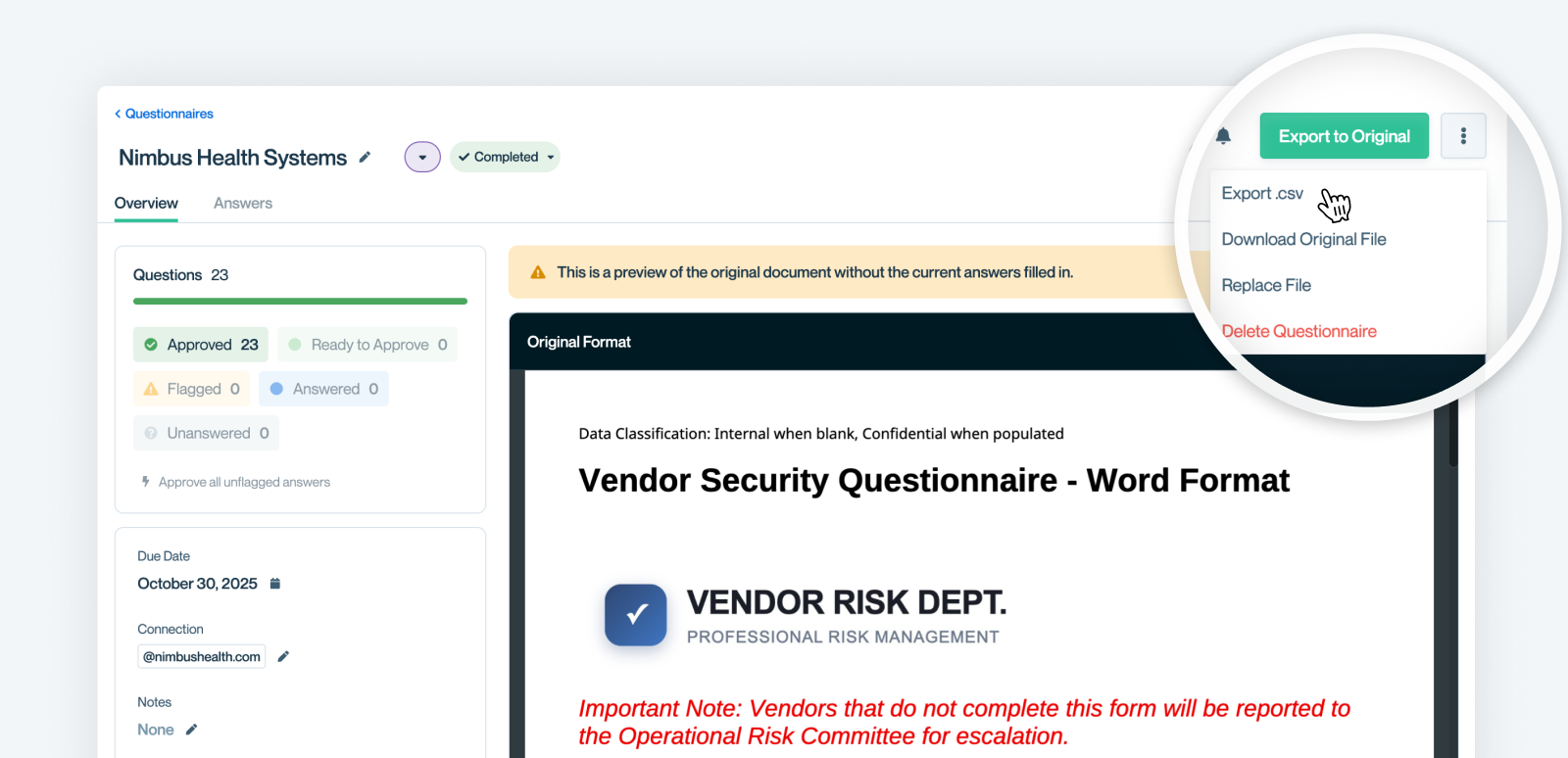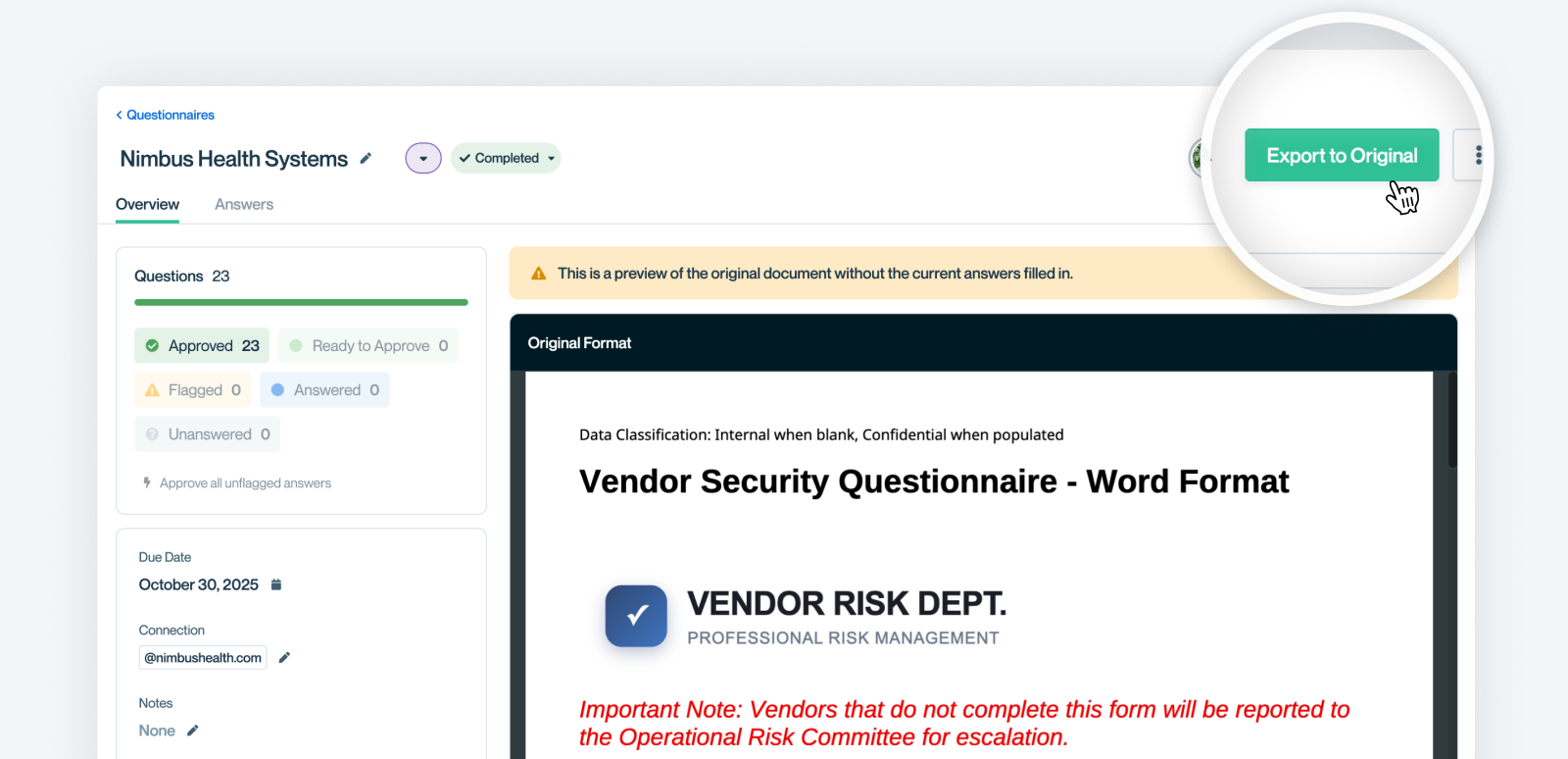 If your questionnaire started as a spreadsheet, Conveyor can export your answers back into the original file, preserving all formatting, tab names, and styles. Simply click Export to Original download the file.