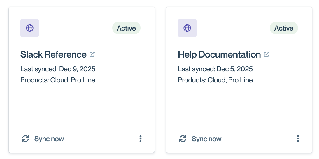 Public sites sync weekly, private sources (Confluence, Notion, Google Drive) sync daily. You can manually trigger syncs anytime.