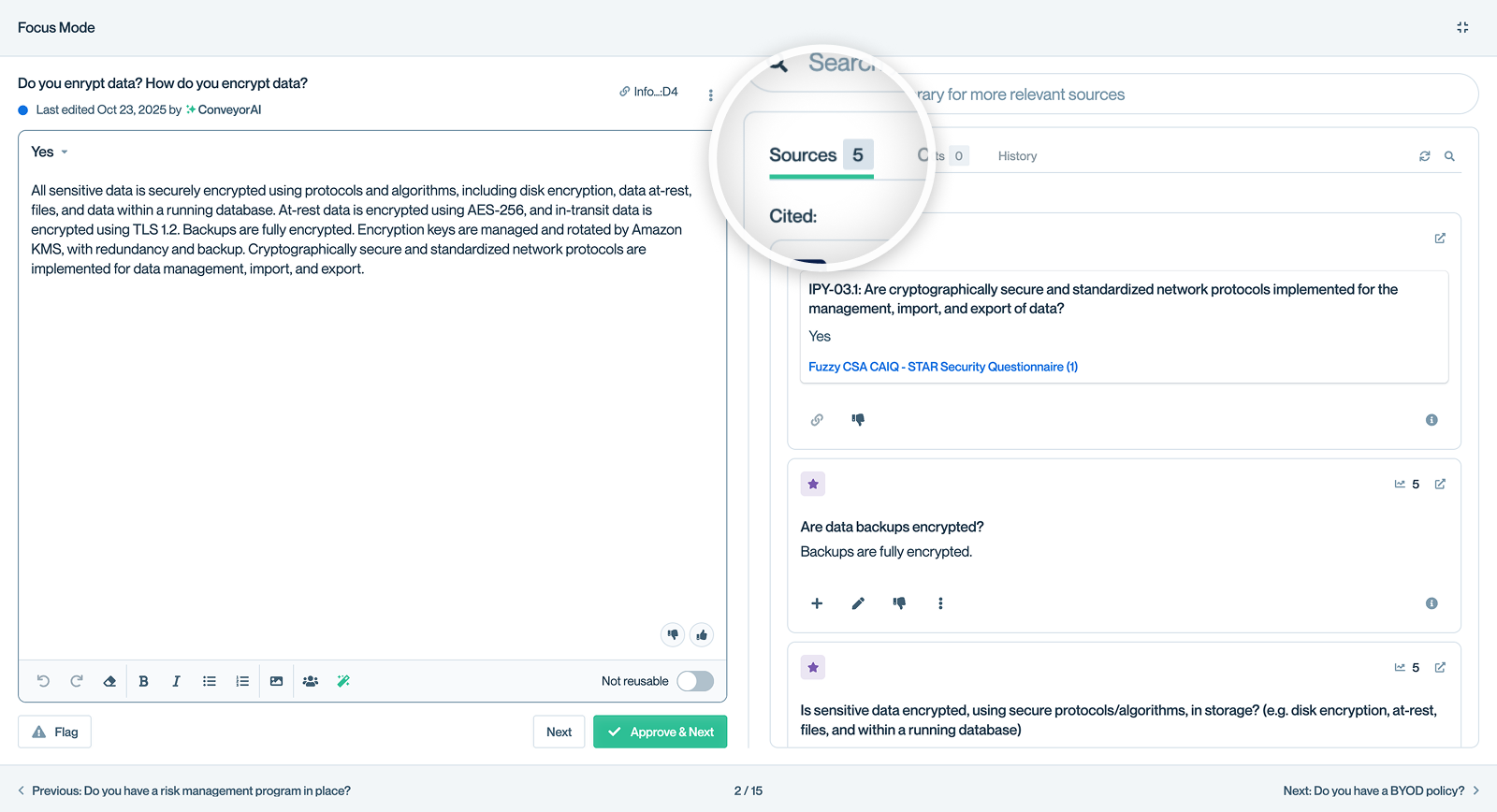 When ConveyorAI is confident enough in the matches found in your library, it will draft a proposed answer to the question. Each answer includes a Sources panel showing exactly where ConveyorAI found the information.
