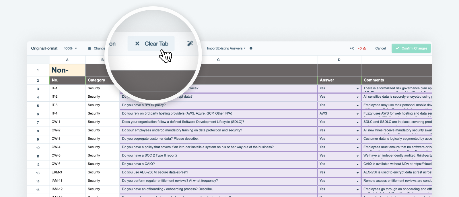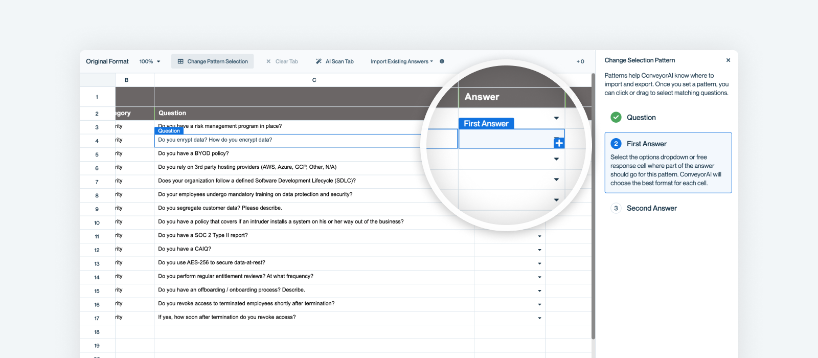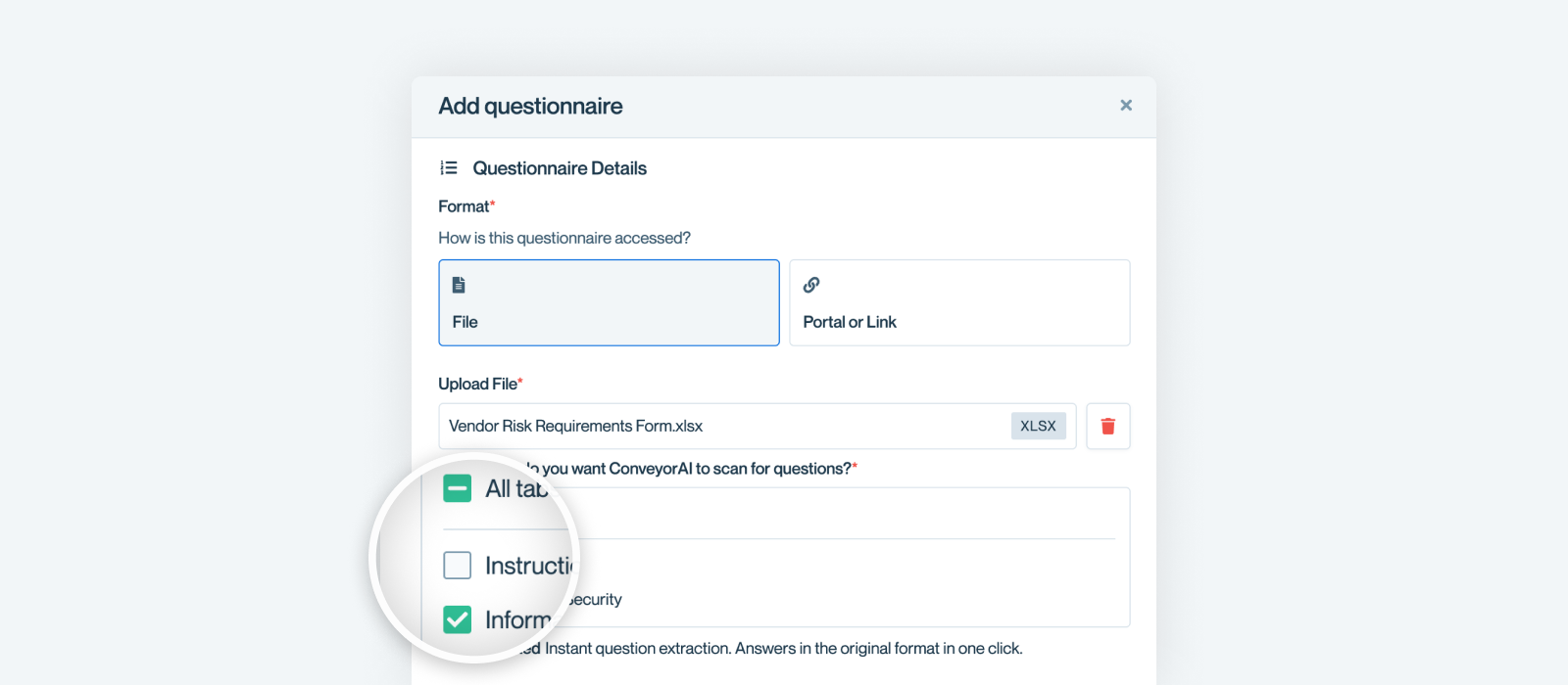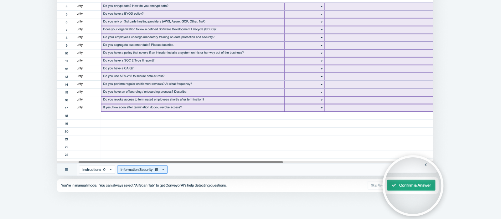 Upload a spreadsheet to let Conveyor automatically find questions across tabs and draft answers.