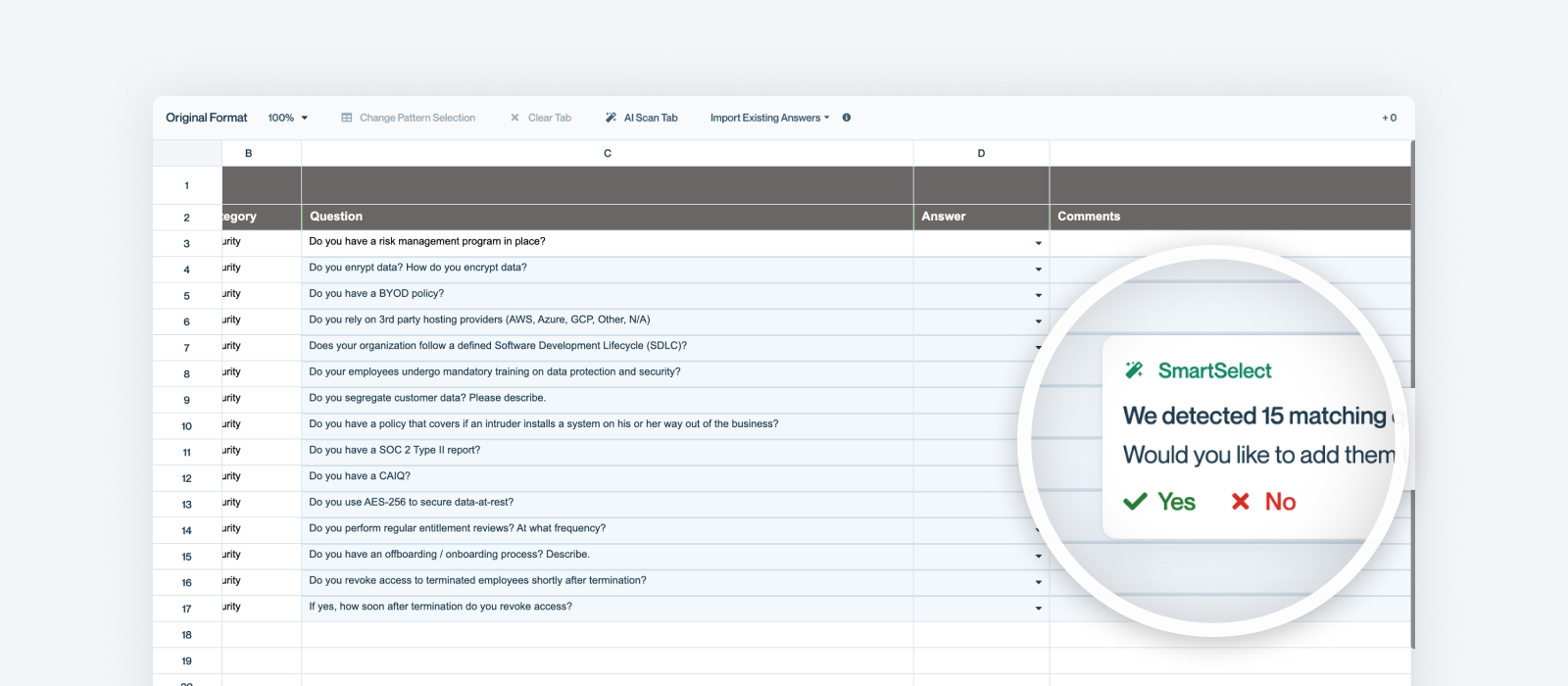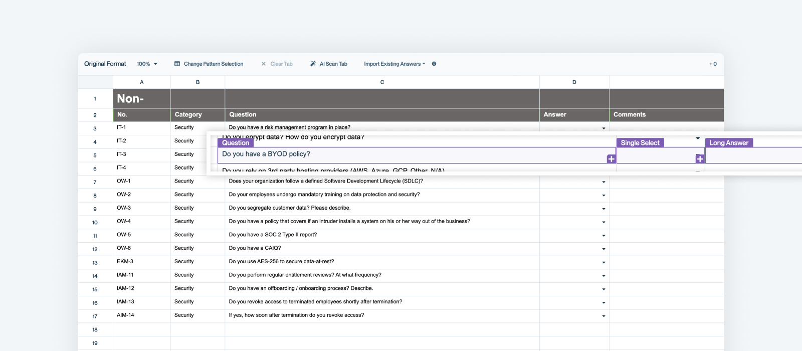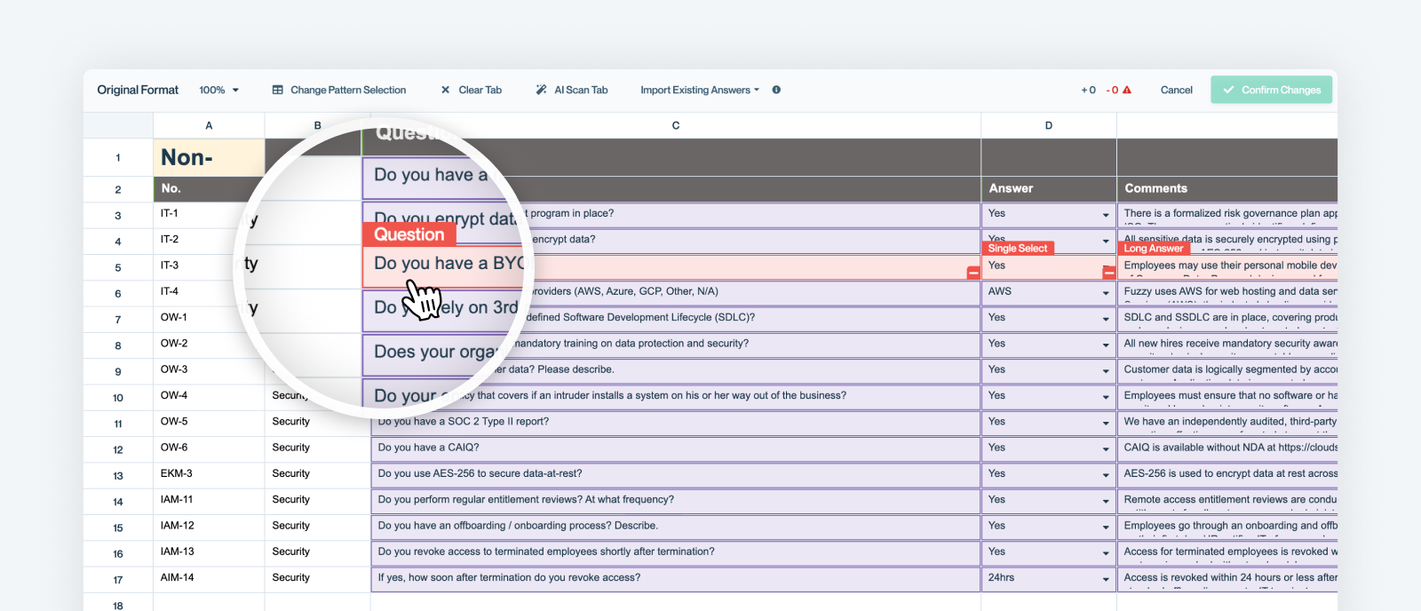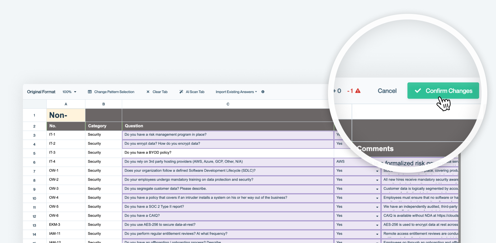 Upload a spreadsheet to let Conveyor automatically find questions across tabs and draft answers.