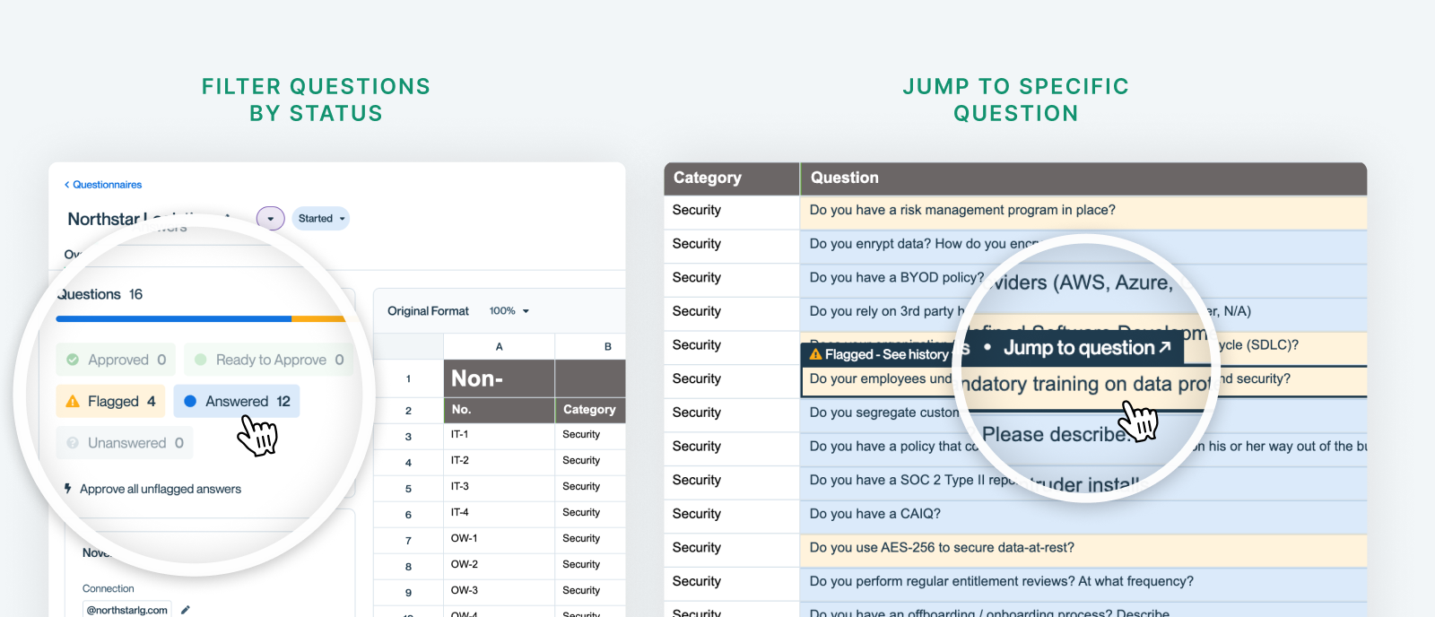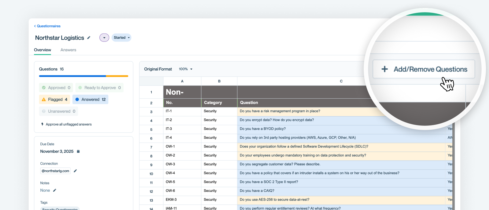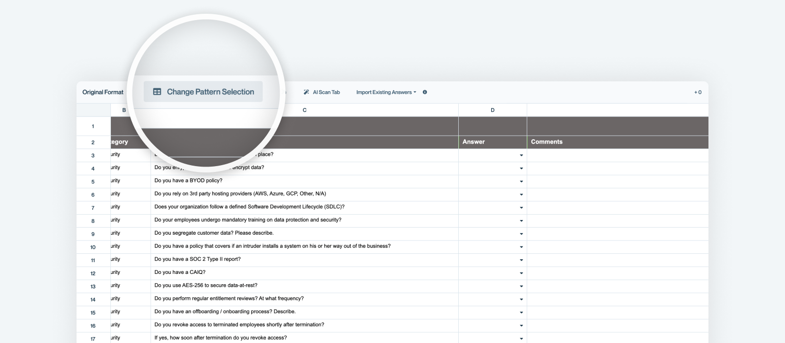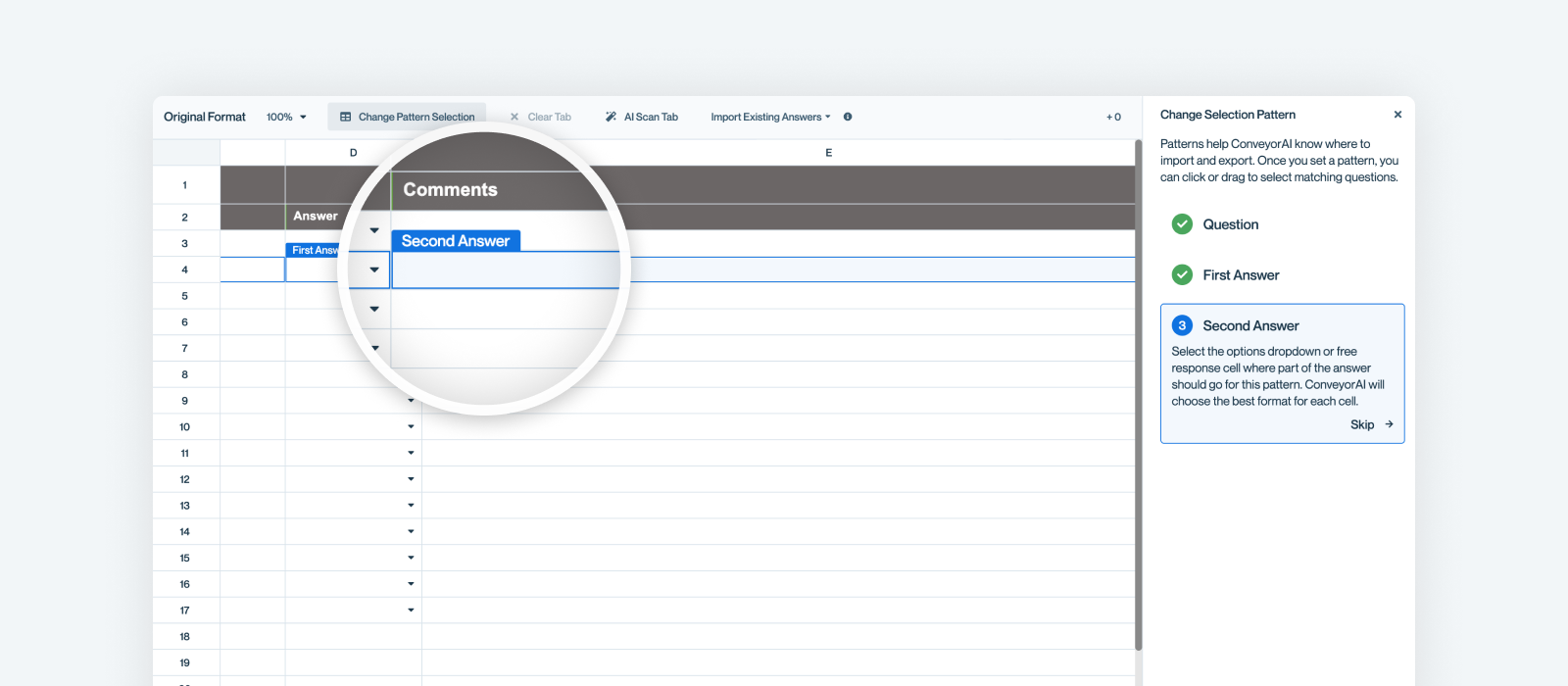Upload a spreadsheet to let Conveyor automatically find questions across tabs and draft answers.