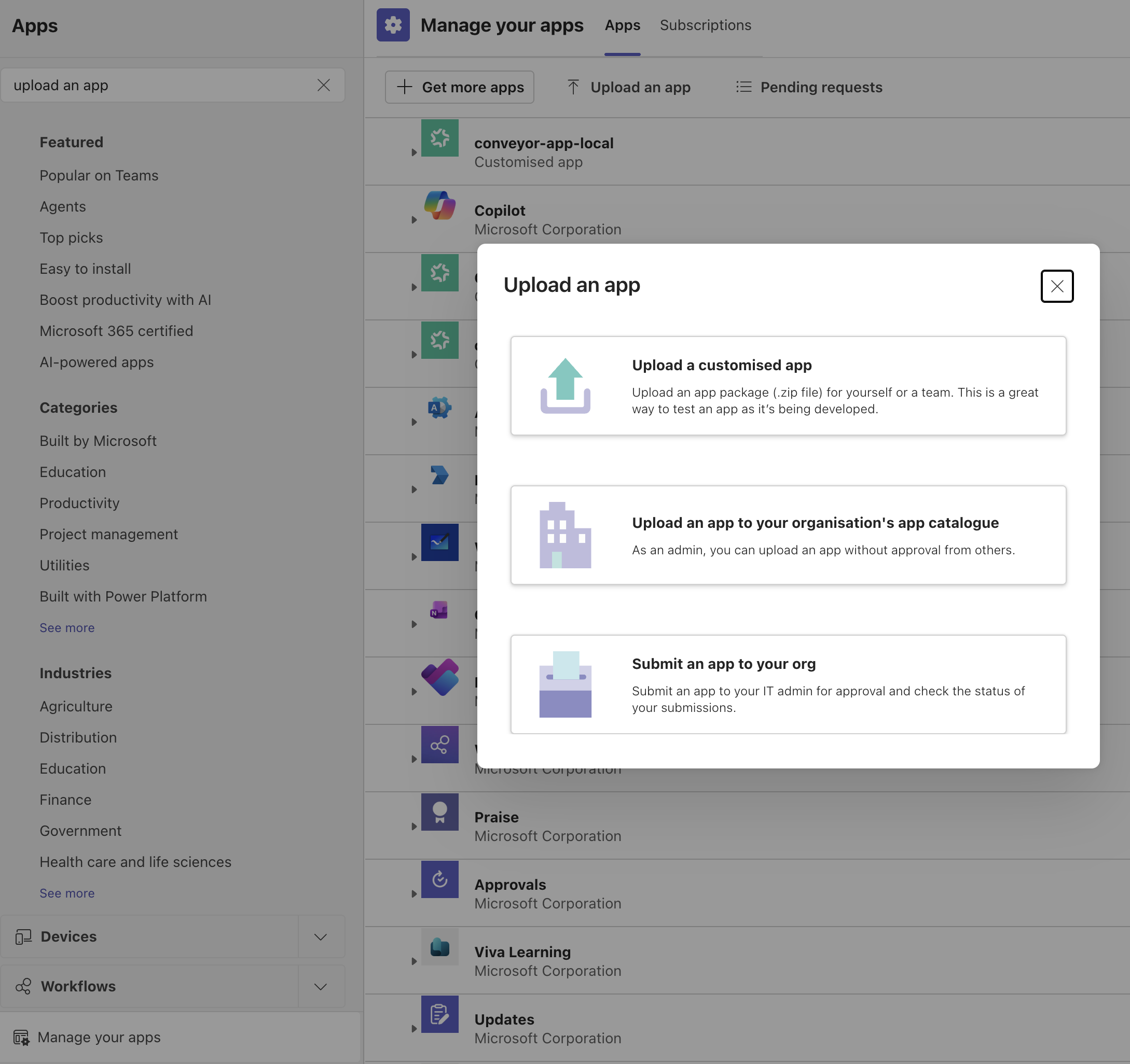 Open Teams and navigate to Apps->Manage your Apps