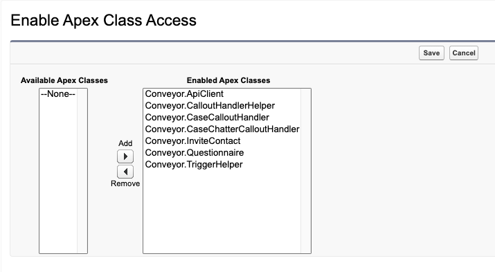- Move all of the Conveyor.* Apex classes over to the "Enabled Apex Classes" column and click "Save"