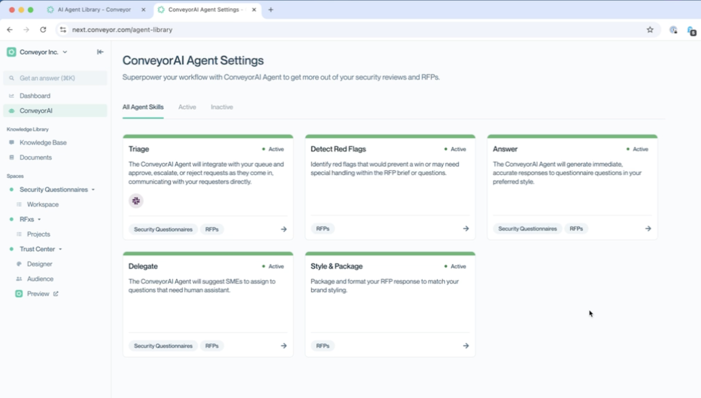 To control how ConveyorAI works, click "ConveyorAI" in the navigation menu on the left side of the screen. Here you will find five Agent settings, across Security Questionnaires and RFPs: