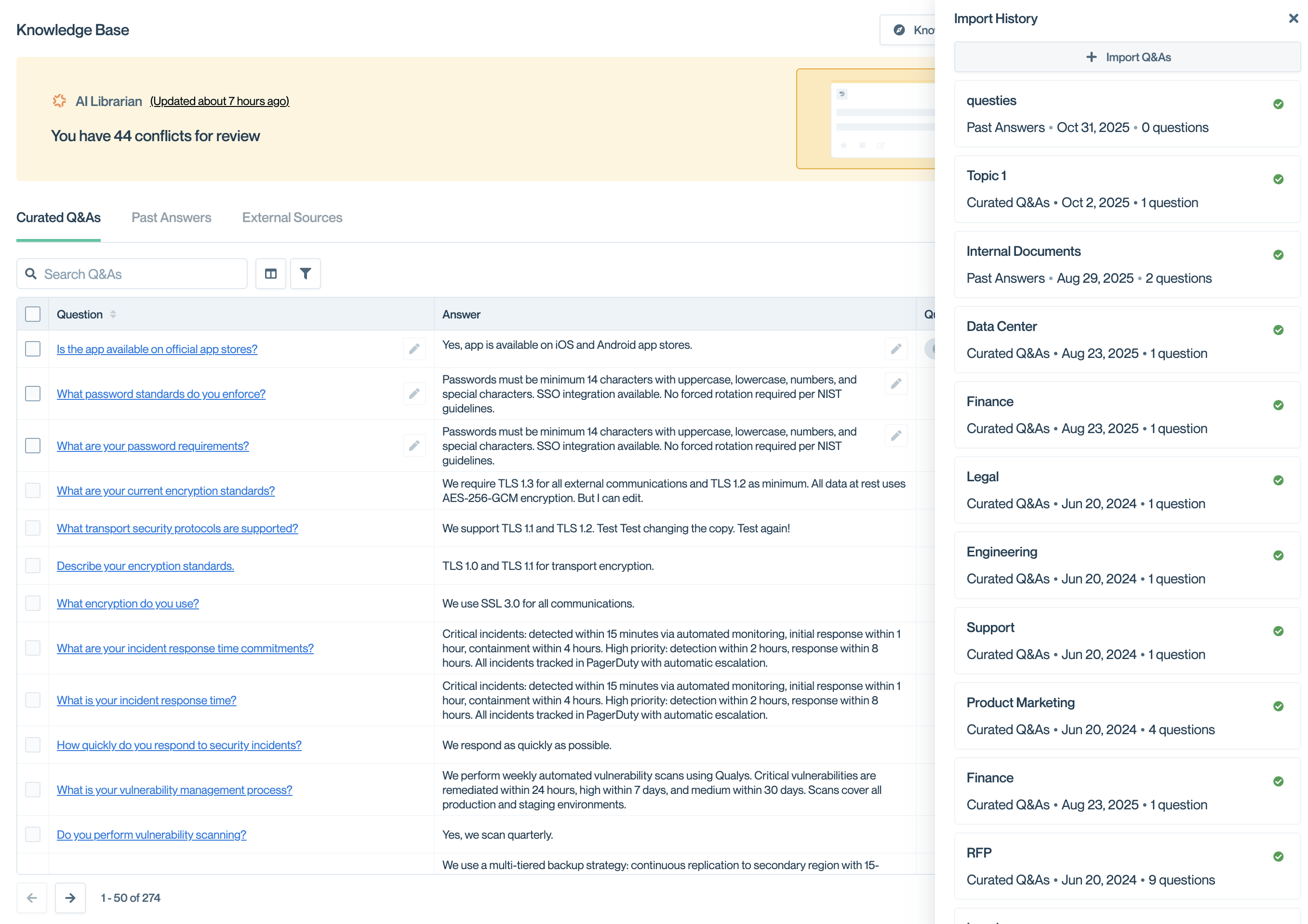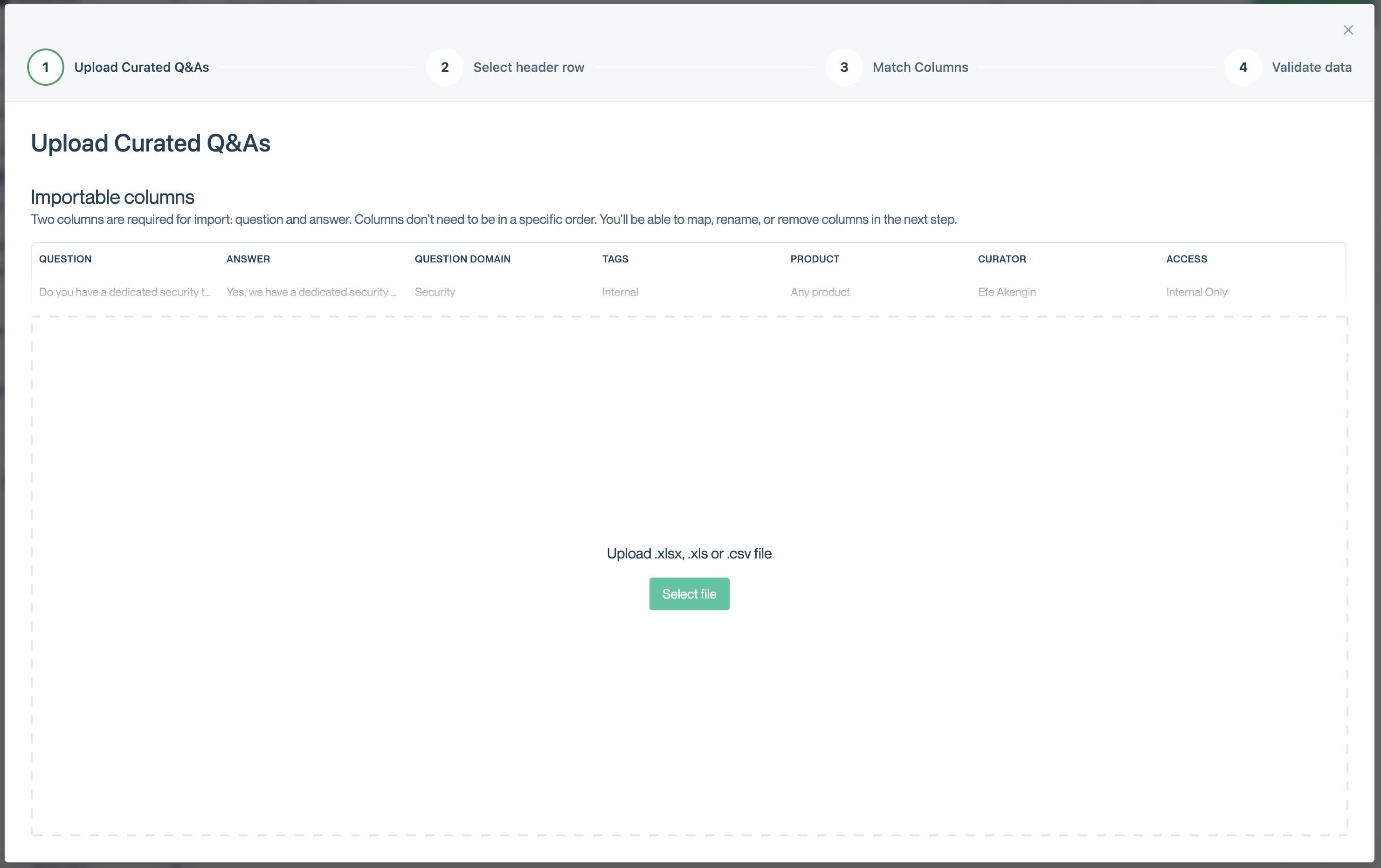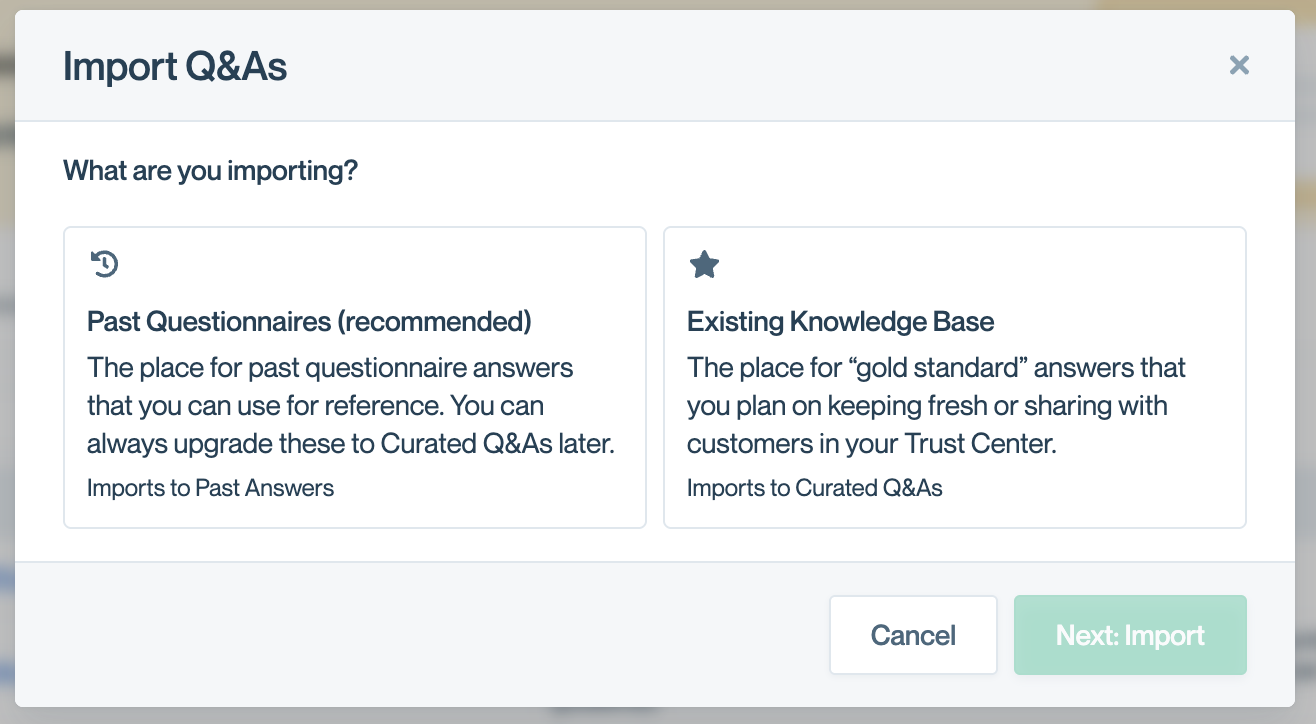 - Choose whether to import as Curated Q&As (maintained answers you'll keep fresh or share with customers) or Past Answers (reference from past questionnaires)