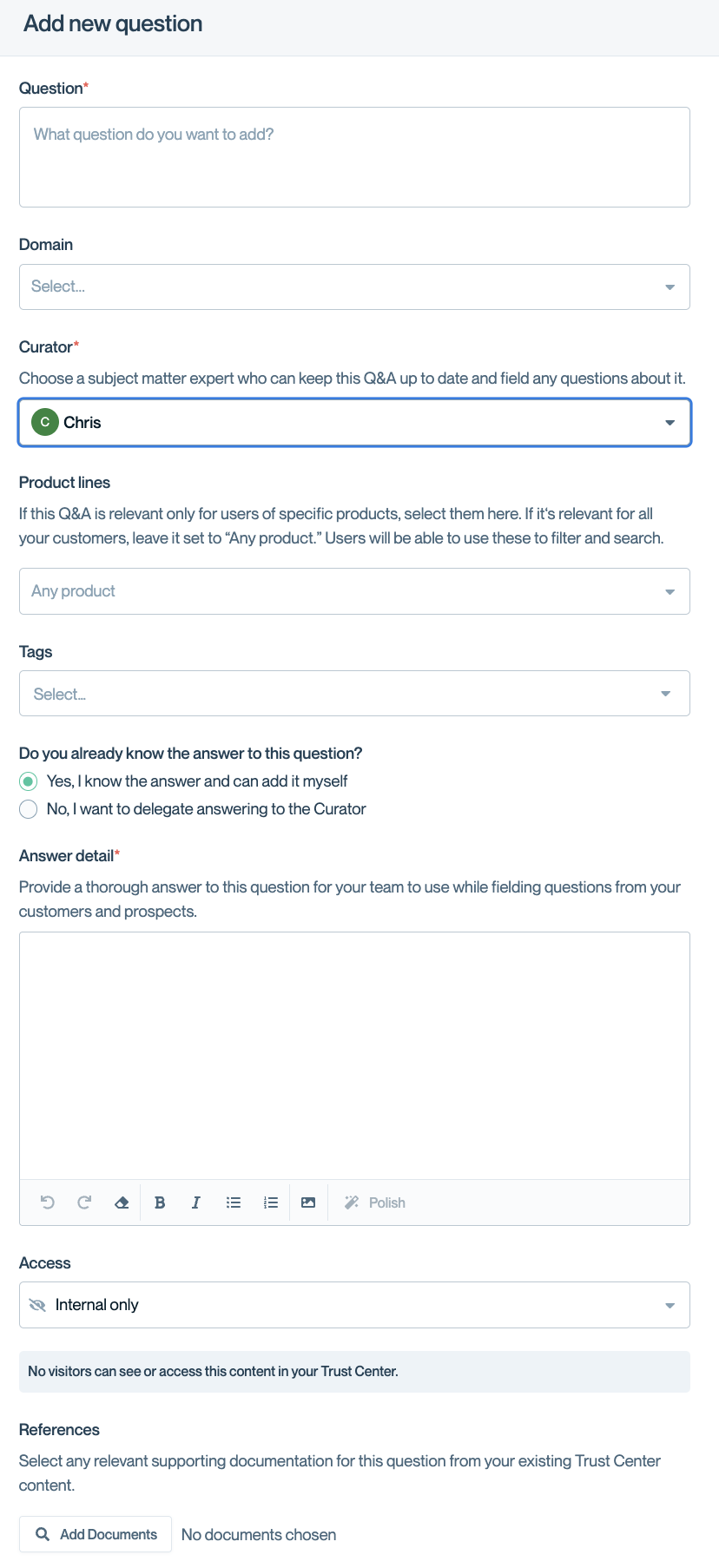 Use Curated Q&As when you plan to actively maintain these answers, share them in your Trust Center, or treat them as authoritative sources. Use Past Answers for reference material from completed questionnaires that you don't need to curate.