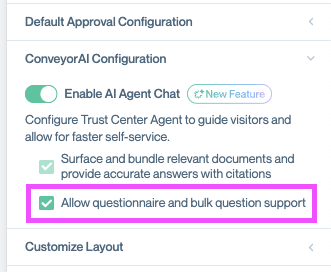The Questionnaire capability extends the Trust Center Agent to help you and your visitors complete security questionnaires faster and with less manual effort. When enabled, the Agent can draft answers to questionnaires and provide linked source citations - all using your approved Trust Center content.