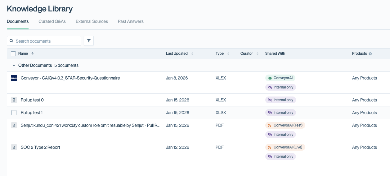 Test questionnaires use documents with "Test environment access" enabled. Check the "Shared With" column in your Knowledge Library to see which documents show "ConveyorAI (Test)" or "ConveyorAI" (both environments).