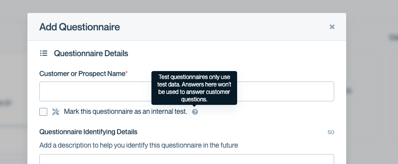 Test questionnaires don't consume usage credits, so you can run as many as you need during evaluation. Answers generated in test questionnaires are isolated from your production data: they won't be saved to Past Answers or influence future customer responses.