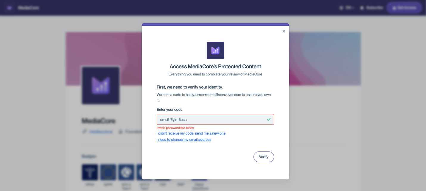 What you're seeing: You or your visitors are seeing a message when they try and access the Trust Center saying that the passwordless token received via email is invalid.