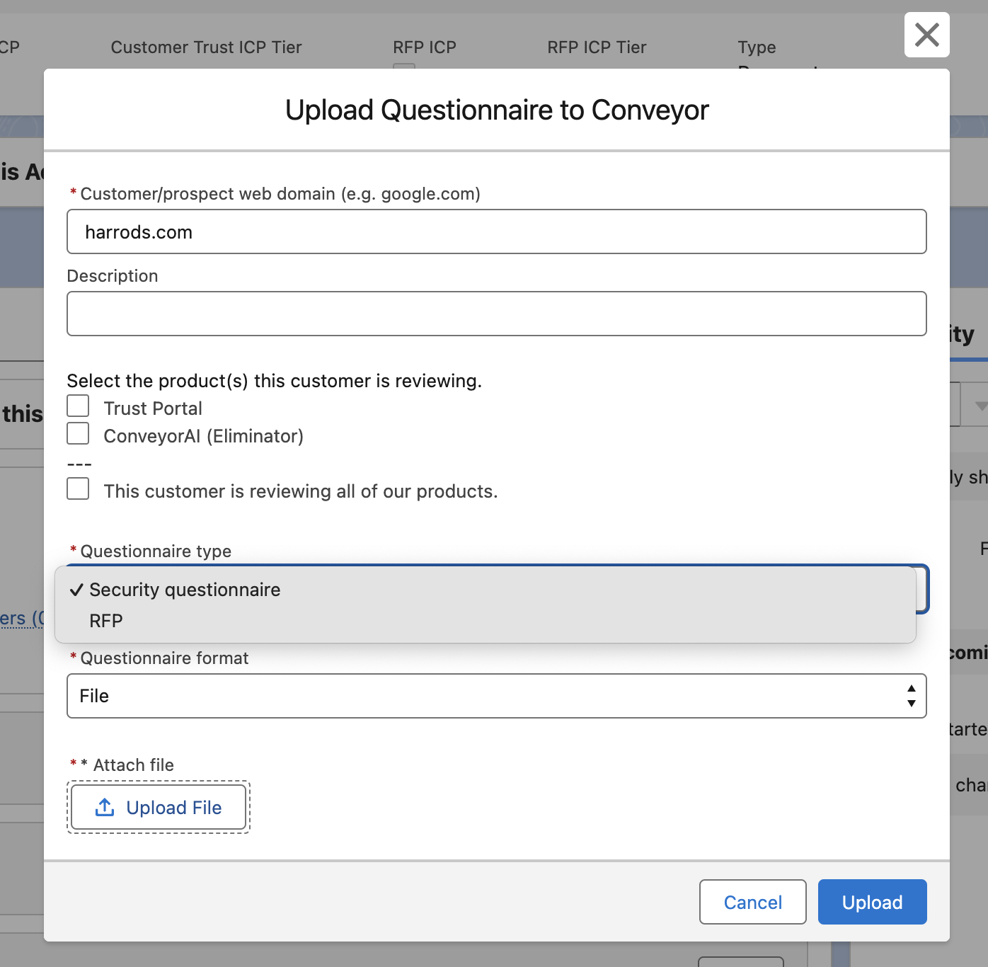 You can add a "Questionnaire type" dropdown to the "Upload Questionnaire to Conveyor" modal form if you'd like. It would look like this: