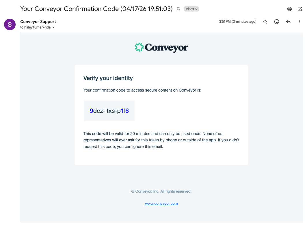 Conveyor uses passwordless authentication. When you return to a Trust Center, you'll verify your identity via a link sent to your email — no password to remember or manage.