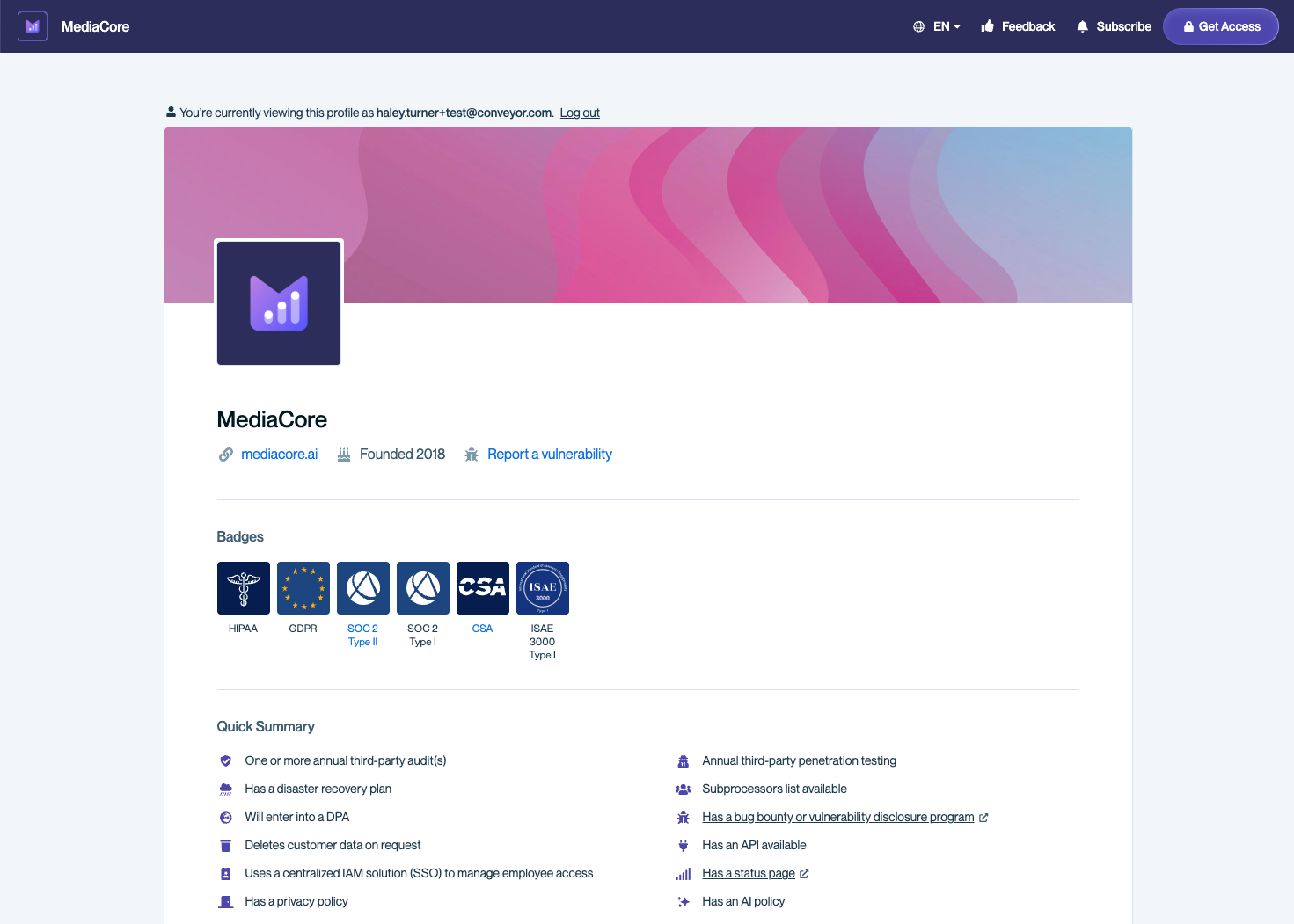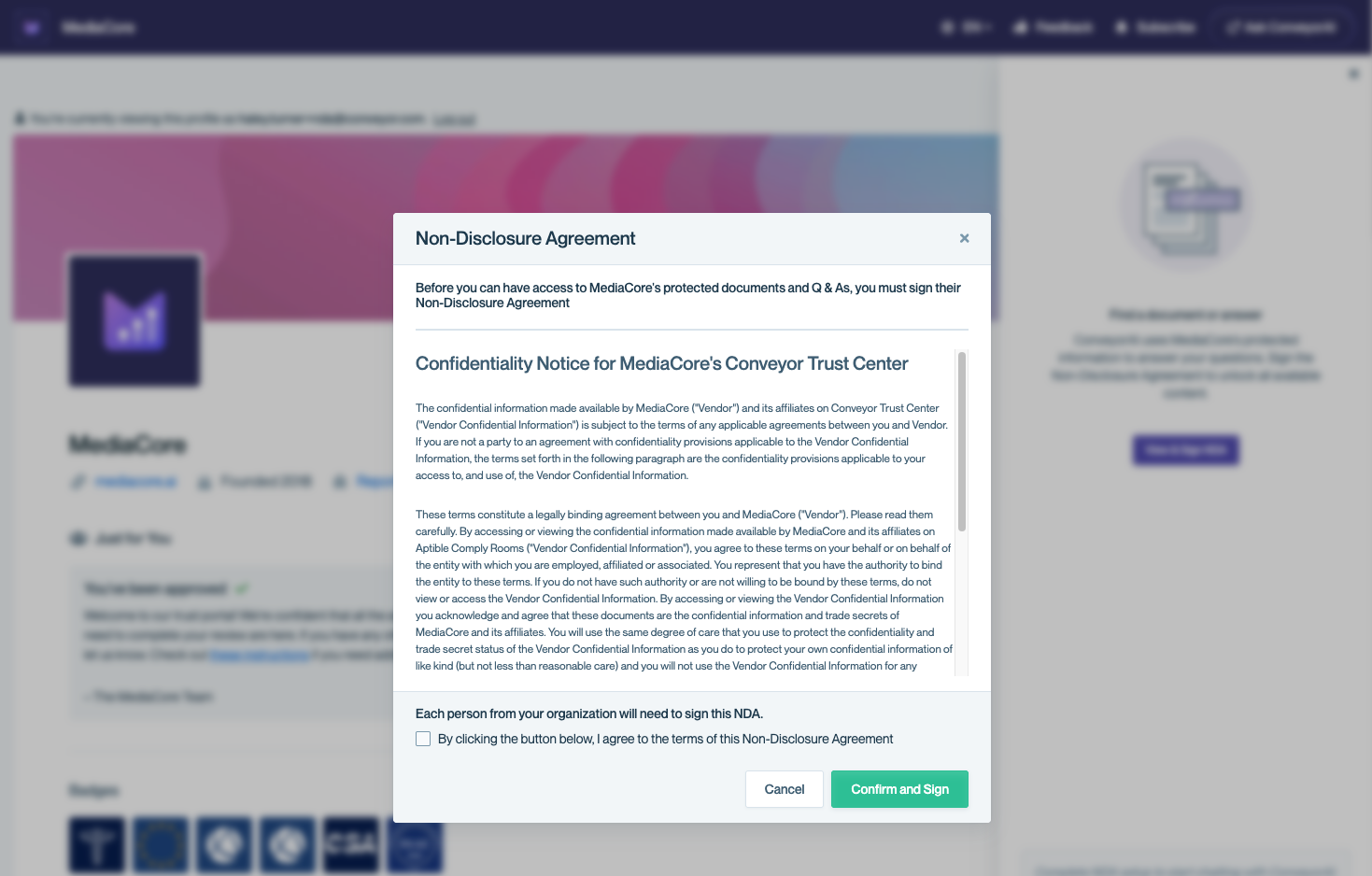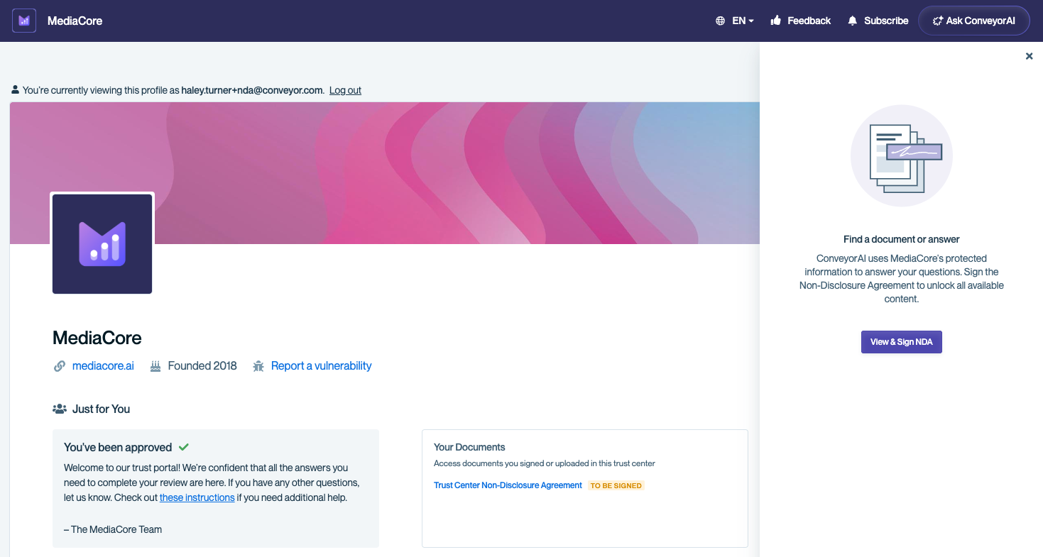 A company you're evaluating uses Conveyor to share their security and compliance documentation. Their Trust Center is where you'll find certifications, policies, audit reports, answers to common security questions, and more — all in one place.