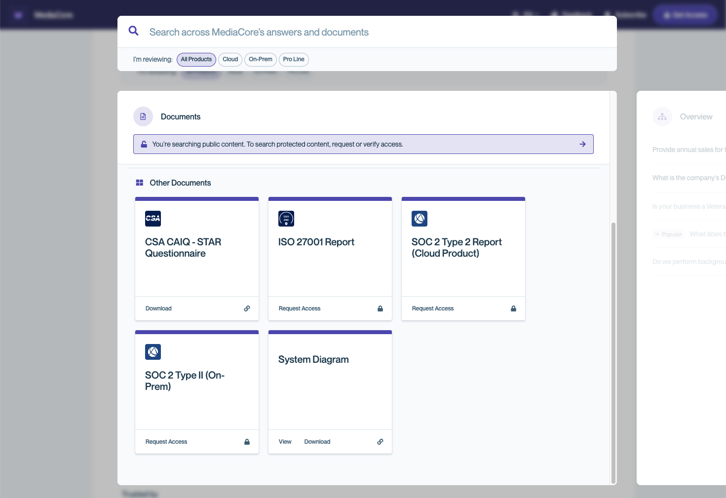 Some content may be visible without signing in. If a Trust Center has public content, you can browse it immediately. You can tell the difference between public and private content prior to requesting access by viewing the lock icon on documents or FAQs.