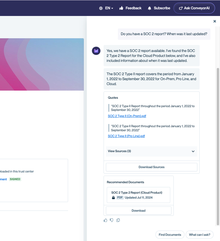 - Ask a question in natural language — for example, "Do you have a SOC 2 Type II report?" or "What is your data retention policy?"